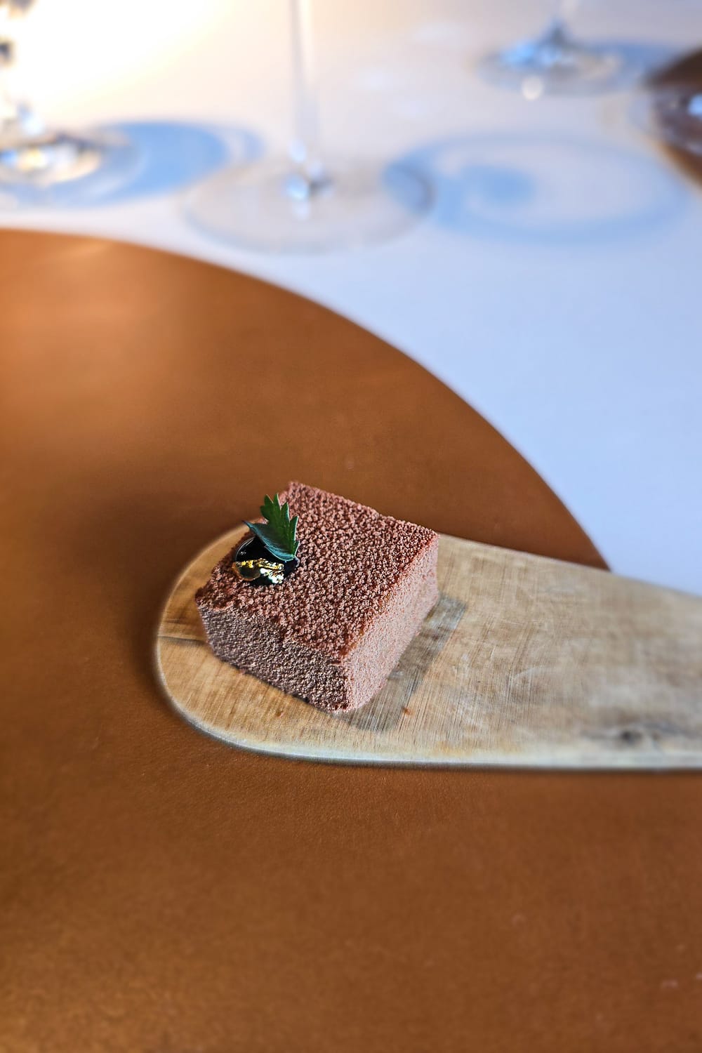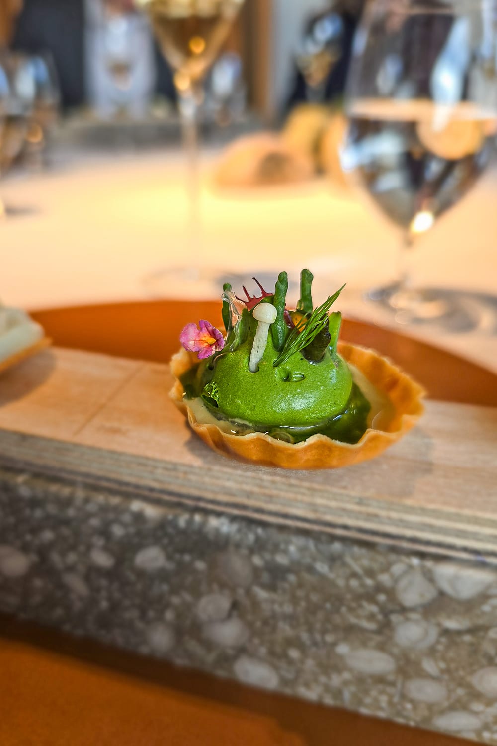 Vaikka alkupalojen määrä kuulosti hengästyttävältä, valtaosa niistä oli pikkuruisia suupaloja. Yhteistä annoksille oli yksityiskohtainen tarkkuus, kuten tuossa yläkuvan annoksessa, joka oli kuin pieni metsä puineen, kukkineen ja sienineen. Jokaisen annoksen tarjoilija esitteli etukäteen. Jos joku seurueestamme sattui olemaan juuri vessareissulla, hän sai pöytään tultuaan esittelyn vielä erikseen.