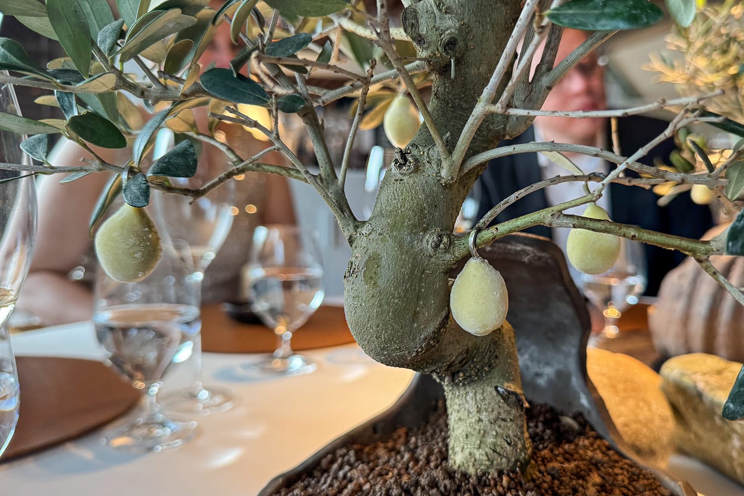 Ehdottomasti parasta El Celler de Can Rocassa on annosten visuaalinen innovatiivisuus. Jo alkupalojen aikana tunnelma oli kuin lapsella jouluaattona: huomasin oikein odottavani, että millainen paketti seuraavaksi kannetaan pöytään. Ja tulihan niitä: muun muassa tuo yläkuvassa oleva oliivi-bonzaipuu, jonka oksilta saimme poimia jäädytetyt oliivinmuotoiset alkupalat. Ne maistuivat aivan suolaiselta jäätelöltä.