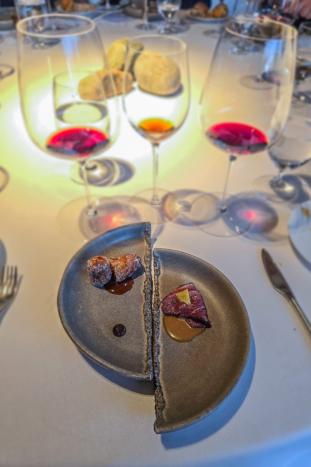 Kun pöytään kannettiin kaunis ja eri väreissä hehkuva langustiini (yllä), oli helppo päätellä, että pääruokien taivasta lähestytään. Makumaailma oli täydellinen! Sama meno jatkui, kun eteen ilmestyi halkaistua lautasta muistuttava kattaus. Ensin huomio kiinnittyi munkkipötkylää muistuttavaan herkkuun ja luulin jo, että olemme siirtyneet jälkiruokaan. Molemmilla lautasilla oli kuitenkin ankkaa eri muodoissaan, kastikkeilla aateloituna. Ihana makean, rapean ja suolaisen yhdistelmä! Annoksen kanssa tuli kolme eri viinitilkkaa: tuo keskimmäinen juotiin kahden annoksen puolivälissä.