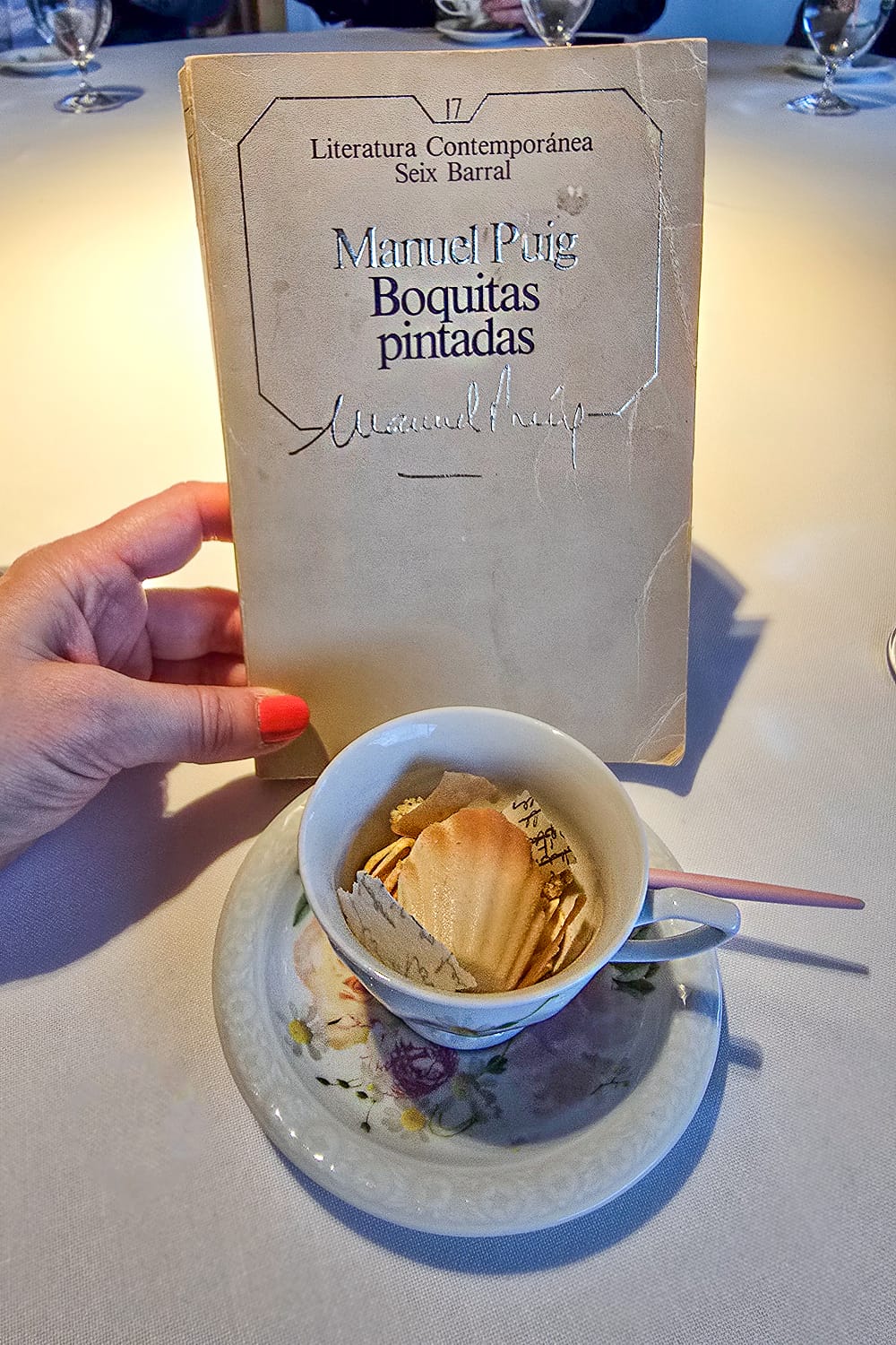 Enpä ole ennen pohtinut, miltä kirja maistuu. Tuoksu on kyllä tuttu. Sellainen vähän pölyinen ja ullakkomainen kirjastoreissu silmät suljettuina. Pääruokien ja jälkiruokien välissä meille tarjoiltiin simpukan muotoinen keksi, jonka vieressä oli tekstillä kirjailtuja lastuja. Tarjoilija kertoi, että joukkoon oli uutettu makua ja tuoksua vanhoista kirjoista. Kattauksen mukana tuli pöytäkoristeeksi argentiinalaisen Manuel Puigin Särkyneen sydämen tango (Poquitas Pintadas), joka on vuodelta 1969.