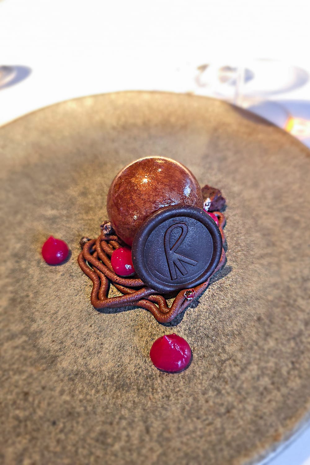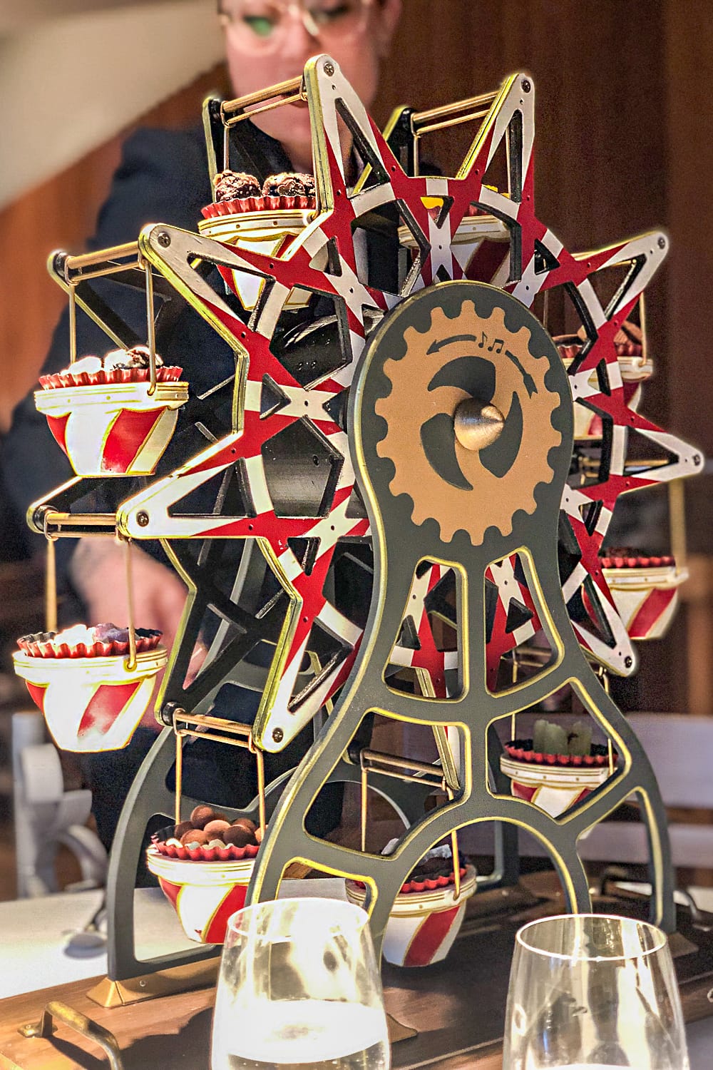 Viimeinen jälkiruoka kannettiin pöytään maailmanpyörän kyydissä. Sitä siirryimme syömään ravintolan baarin puolelle, jotta henkilökunta pääsi siivoamaan pöytiä seuraavaa kattausta varten. Tämäkin siirtymä hoidettiin tosi sulavasti eikä tuntunut siltä, että meitä olisi haluttu häätää pois.