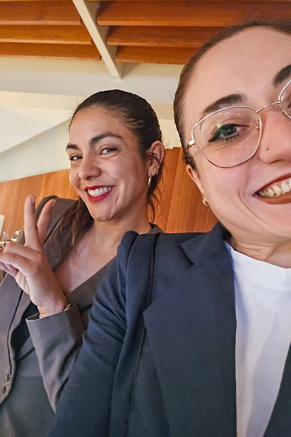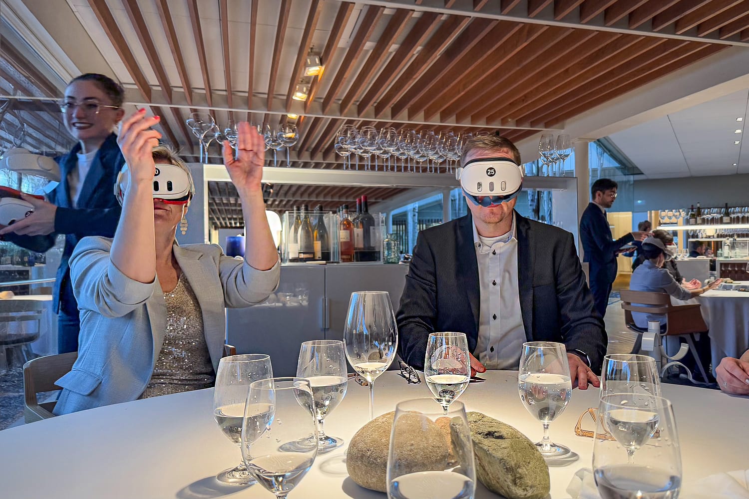 Juuri, kun ajattelimme, että lounas alkaa olla loppusuoralla, meille ojennettiin virtuaalilasit. Linssit muuttivat pöydän interaktiiviseksi näyttämöksi ja meidät sen osaksi: sormenpäistämme tuprutti savua ja pöytä täyttyi pienistä vihreistä ukoista, jotka tanssivat (tiedän, miltä tämä kuulostaa...). Laskiessani käteni pöydälle näytti kuin miniatyyrihahmot olisivat sambanneet kämmenelläni. Kun siirryimme syömään eteen tuotuja suklaakuulia, pöydän yllä räjähteli kuin uudenvuoden ilotulituksessa. Hämmentävää meininkiä.