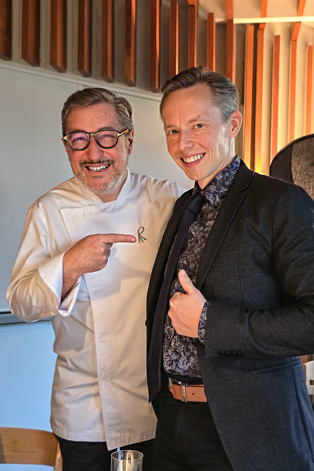 Liki seitsemän tuntia kestänyt lounas huipentui Joan Rocan vierailuun ja poseerauksiin synttärisankarin kanssa. Yllätykseksi koko kahdeksan hengen seurueemme pääsi vielä tutustumiskierrokselle keittiön puolelle. Oli huikeaa seurata vierestä, kuinka keittiössä valmisteltiin tuttuja annoksia seuraavaa kattausta varten.