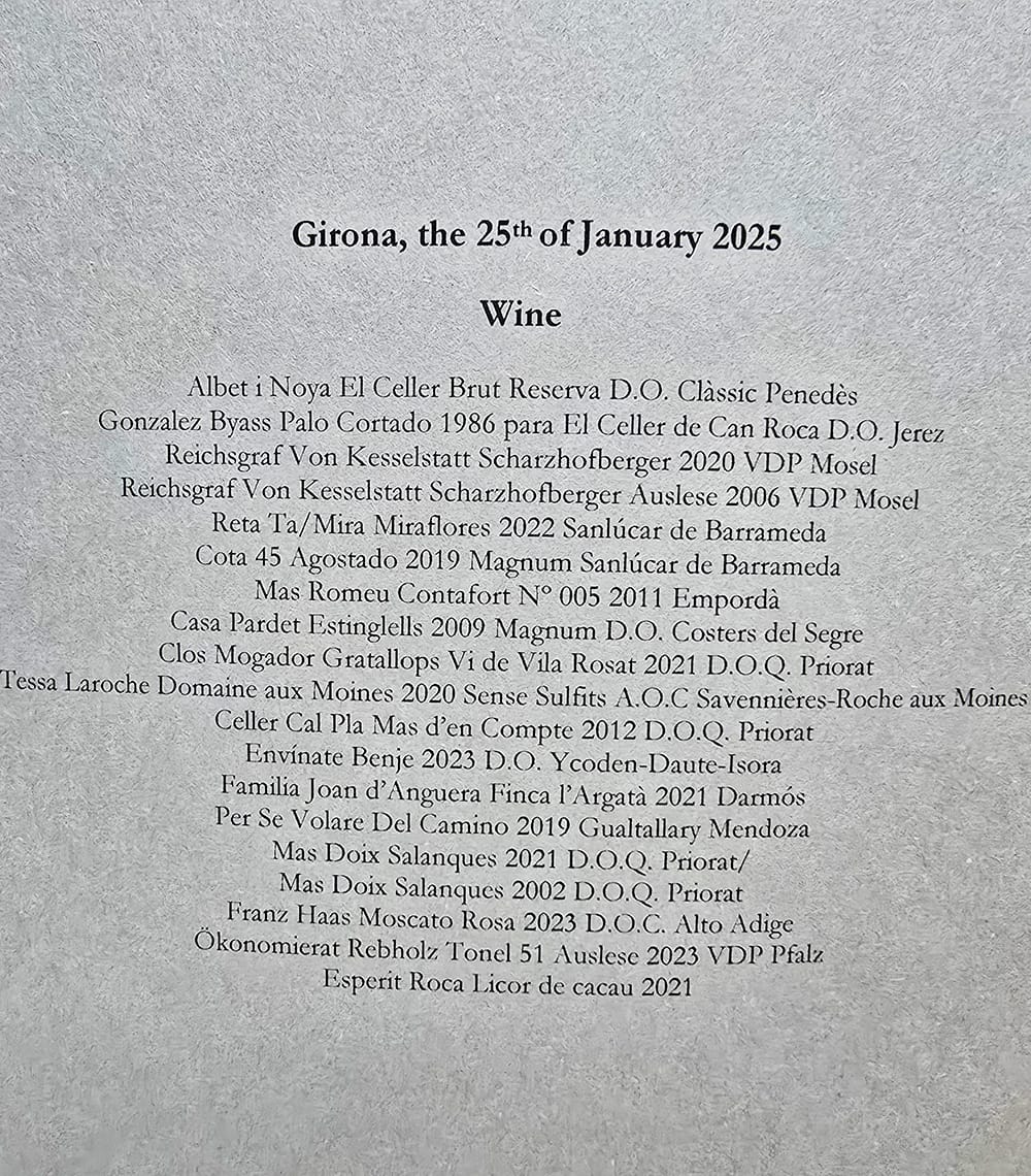 Yllätyksellisyys leimaa El Celler de Can Rocan gastronomiaa. Se kävikin selväksi heti ensimmäisen annoksen kohdalla: eteemme tuotiin pieni valkoinen astia, jonka pohjalle kaadettiin kolme eri liemikerrosta. Ensin pohjalle muodostui Joan Rocan kasvojen profiili, seuraavaksi Josephin hahmo ja lopulta nuorimman veljen, Jordin kuva. Hauska yksityiskohta oli, että jokainen heistä oli suunnitellut oman "liemensä". Astia on todennäköisesti tehty 3D-tulostusta hyödyntämällä.