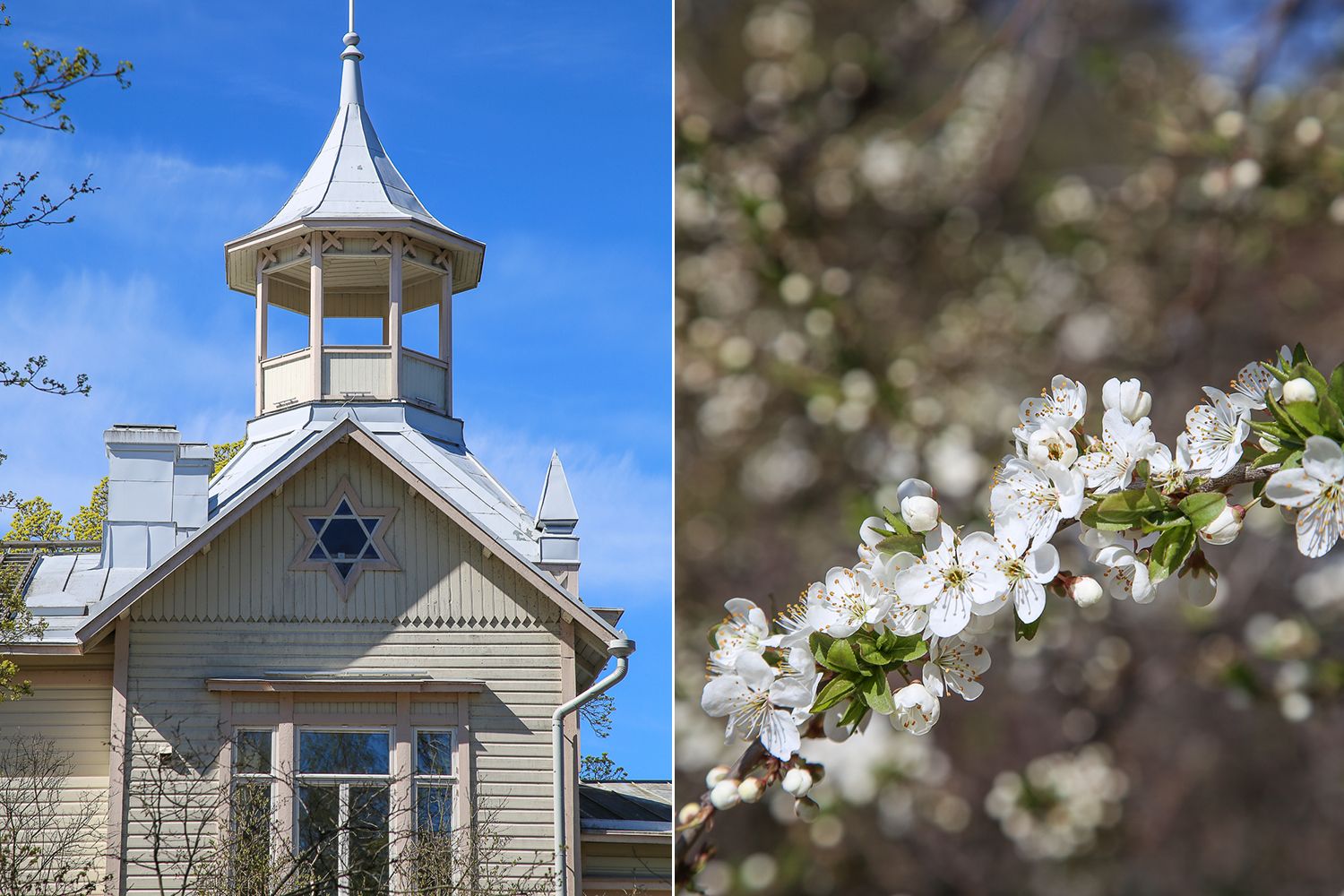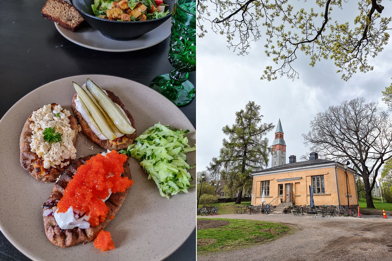 Mäntymäelle on muuten ilmestynyt kivat kuntoportaat, joita pitkin pääsee kipuamaan. Samaisesta puistikosta löytyi pari jumalaisen kaunista kirsikkapuuta. Ei tarvinnut Roihuvuoren ryysikseen lähteä. Toinen uutuus, Pikku-Finlandian kahvila elävöittää Töölönlahden rantaa myös. Tosin me päädyimme lounaalle Hakasalmen huvilan pihapiiriin, jonka kahvila on saanut uuden nimen ja omistajat. Rakastan-kahvilassa kaikki on vegaanista. Ja hyvää muuten onkin!