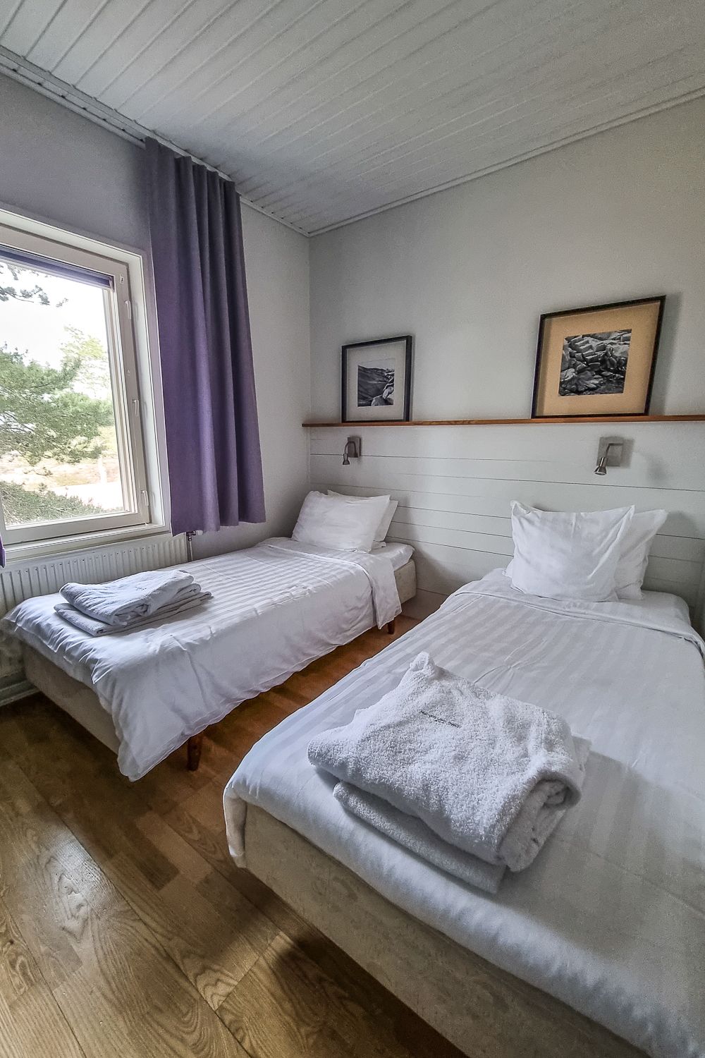 Edullisempaa majoitusta on tarjolla hotellirakennuksissa, jossa minäkin yövyin. Hinta tuosta alakuvan kahden hengen huoneesta on sesonkiaikana 180-195 euroa yöltä. Merinäköalaa huoneissa ole, mutta pakettiin sisältyy aamiainen. Myös pieni kylpylä ja sähkösaunat ovat hotellivieraiden käytössä.