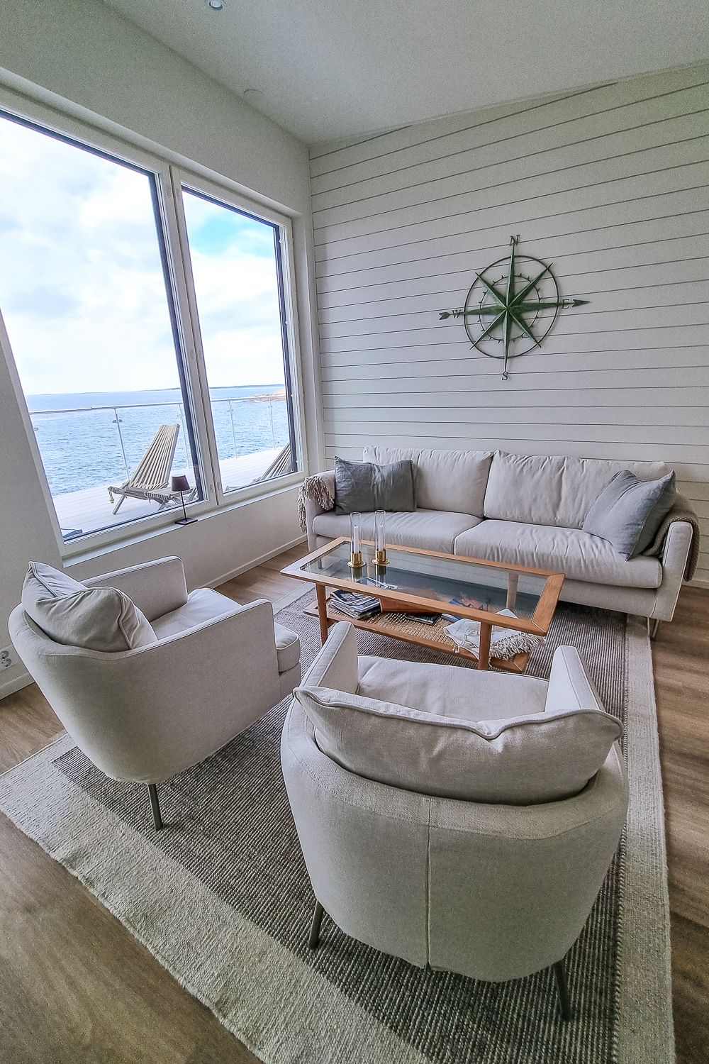Majoituspuolellakin löytyy valinnanvaraa. Kävimme katsastamassa upeita rantahuviloita, joiden seinänkokoisista ikkunoista avautuu näkymä merelle. Hintakin oli toki hulppea: esimerkiksi tuo alakuvan 57-neliöinen, yhden makuuhuoneen huoneisto maksaa kesäsesonkina 350 euroa yöltä. Sijainti on kyllä loistava ja sisustus viimeisen päälle tyylikäs, mutta ei täällä viikkoa näillä hinnoilla raaskisi olla.