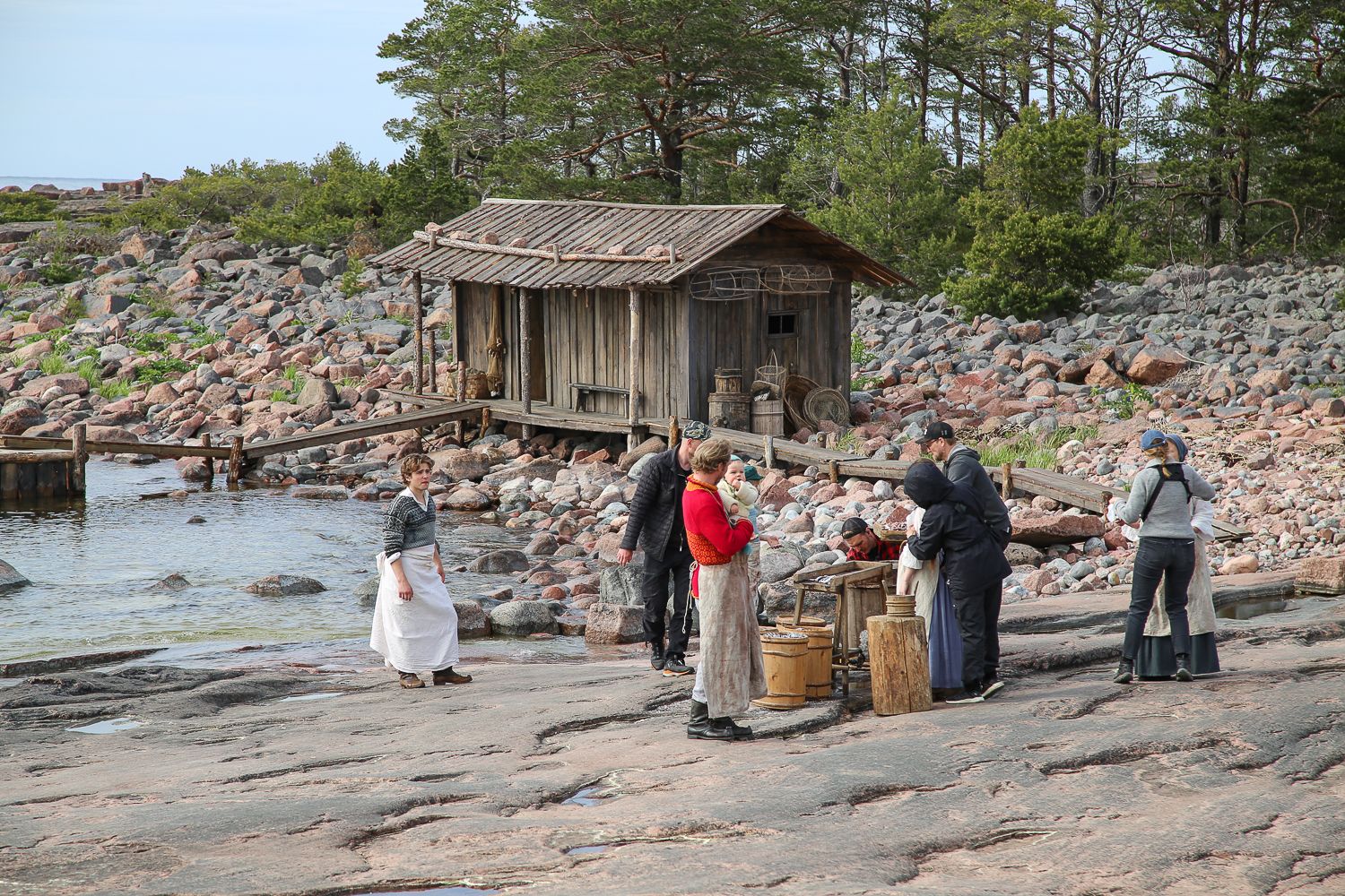 On aina yhtä hämmentävää nähdä, kuinka valtavan suuren joukon ponnistelu leffaproduktioon tarvitaan. Alkukesästä Getan sileille rantakallioille rakennettiin lavasteeksi pari taloa ja rantavaja. Myös puvustajilla on ollut epookissa melkoinen urakka. Myrskyluodon Maijaa on kuvattu Turussa, Helsingissä ja Ahvenanmaalla eri vuodenaikoina viime syksystä lähtien. Helmikuun talvikuvauksissa lunta oli saaristossa niin niukasti, että sitä piti tehdä kuulemma selluloosasta.