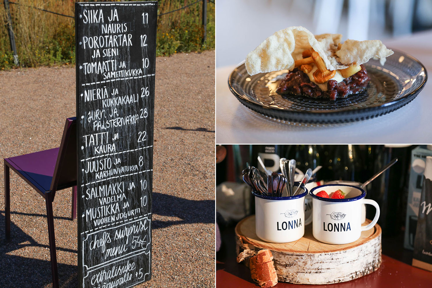 Me keskityimme touhusta hauskimpaan, syömiseen. Buukkasimme lounaspöydän ravintola Lonnasta, joka hyödyntää hienosti kotimaisia kausimakuja ja lähituottajien herkkuja. Ruokalista vaikutti niin hyvältä, että tuli kiskaistua alku, pää- ja jälkiruuat viinisuositusten kera. Hannakin löysi listalta hyvin syötävää, vaikka allergiat aiheuttavat ravintoloissa toisinaan haasteita.