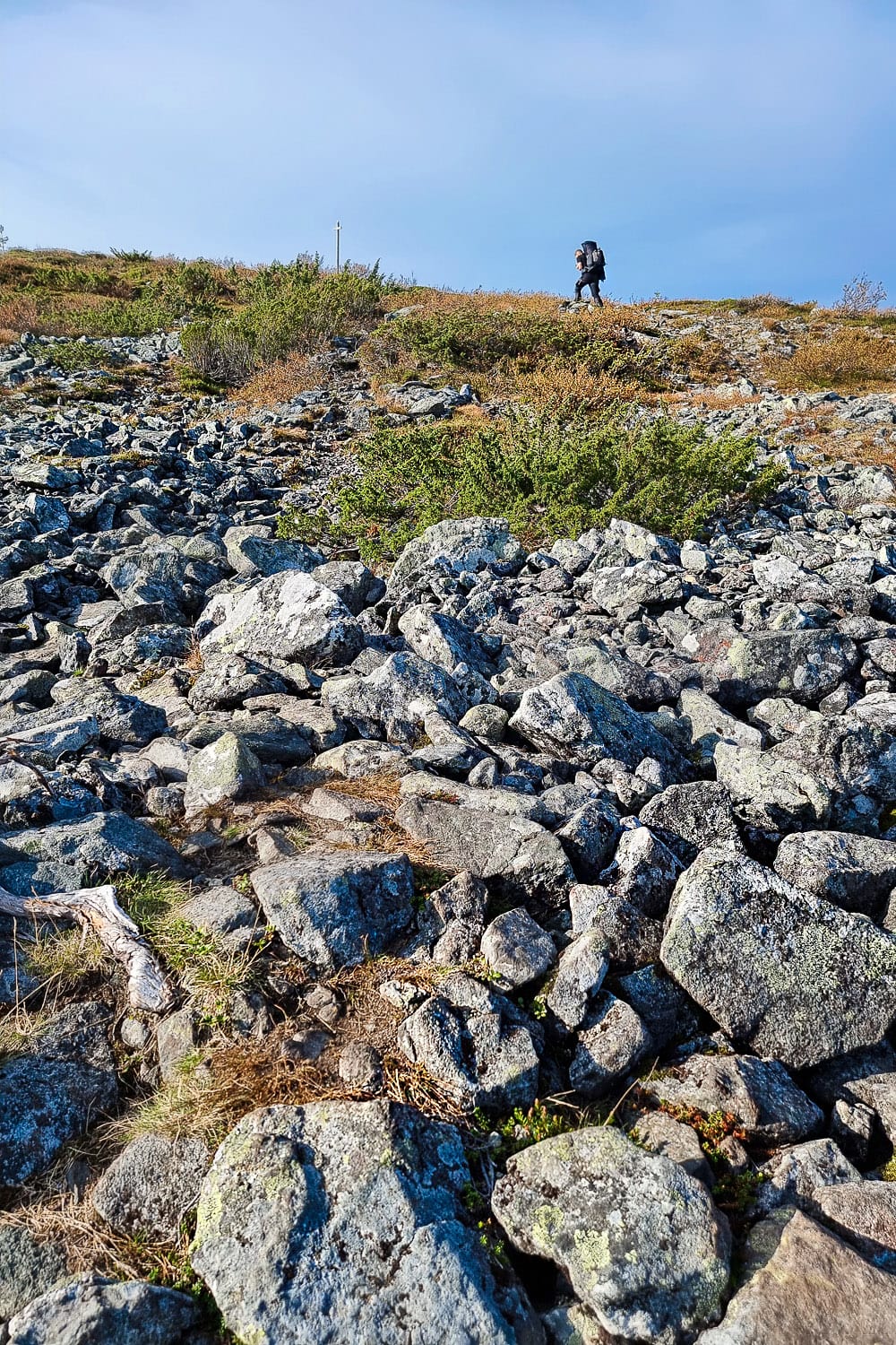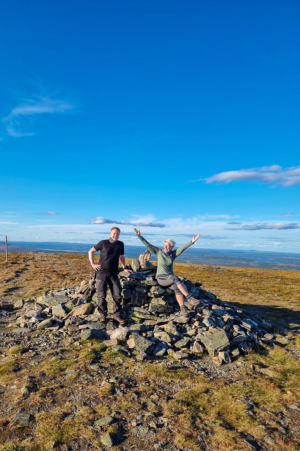 Pallas-Yllästunturin päässä kohoava Taivaskero on reitin korkein kohta (809 m), mutta maisemallisesti paikka ei tehnyt meihin niin suurta vaikutusta. Iso osa reitin loppuosuudesta on täynnä karua kivikkoa, jossa nouseminen ottaa kyllä voimille ja haastaa tasapainoa, mutta vau-elämykset tulivat vastaan huomattavasti aiemmin. Pallaksen päässä on myös ruuhkaisempaa ja enemmän päiväretkeilijöitä. Historiallinenhan Taivaskero toki on, sillä sen huipulla sytytettiin olympiatuli vuonna 1952.