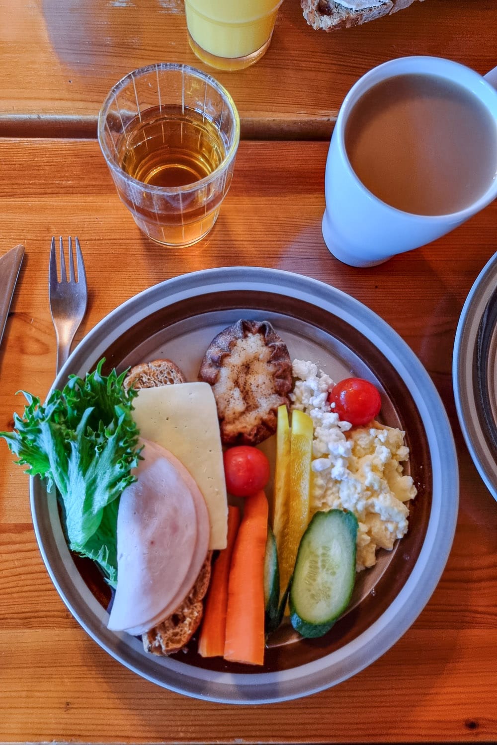 Ruoaksi pakkasimme pakastekuivattuja, valmiita retkimuonapusseja. Nuo ovat siinä mielessä käteviä, että pussi toimii myös astiana: mukaan lisätään vain keitetty vesi ja ruoka hautuu kypsäksi itsestään. Retkimuonien huono puoli on, että niihin kyllästyy nopeasti. Pari päivää jaksaa vetää aamiaisen, lounaan ja päivällisen pussista, mutta sitten chili con carnet ja pasta carbonarat alkavat toistaa itseään. Olimme iltaisin usein myös niin väsyneitä, ettemme jaksaneet enää teltan pystyttämisen jälkeen ruveta kokkaamaan. Silloin oli helpointa kaivaa laukusta vain paahtoleipää ja kuorruttaa se Kallen mätitahnalla, Baby Bells -juustolla ja minisalamipötköillä. Kyytipojaksi olin hommannut meille minikokoisissa muovipulloissa punkun, Baileysit ja jallun.