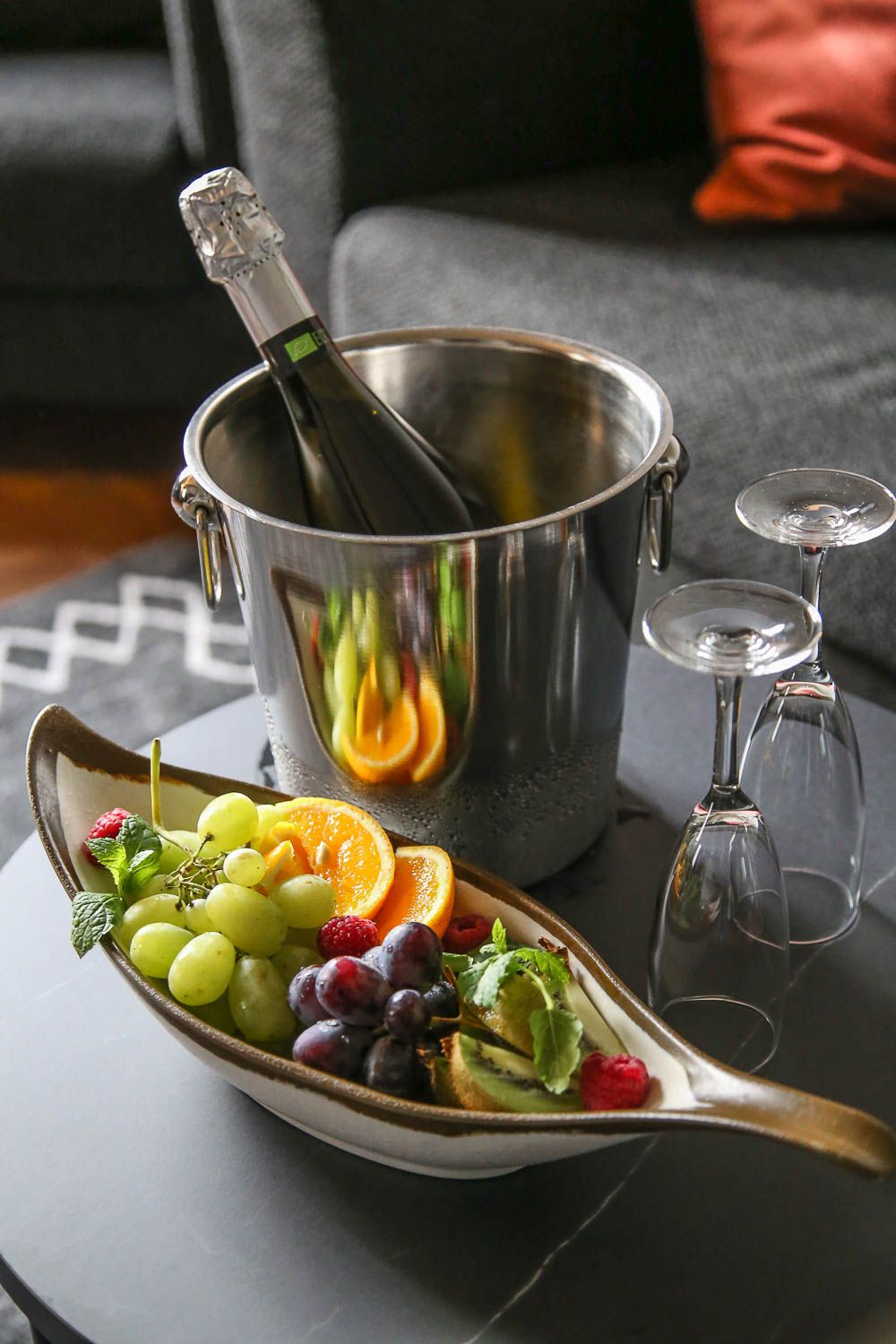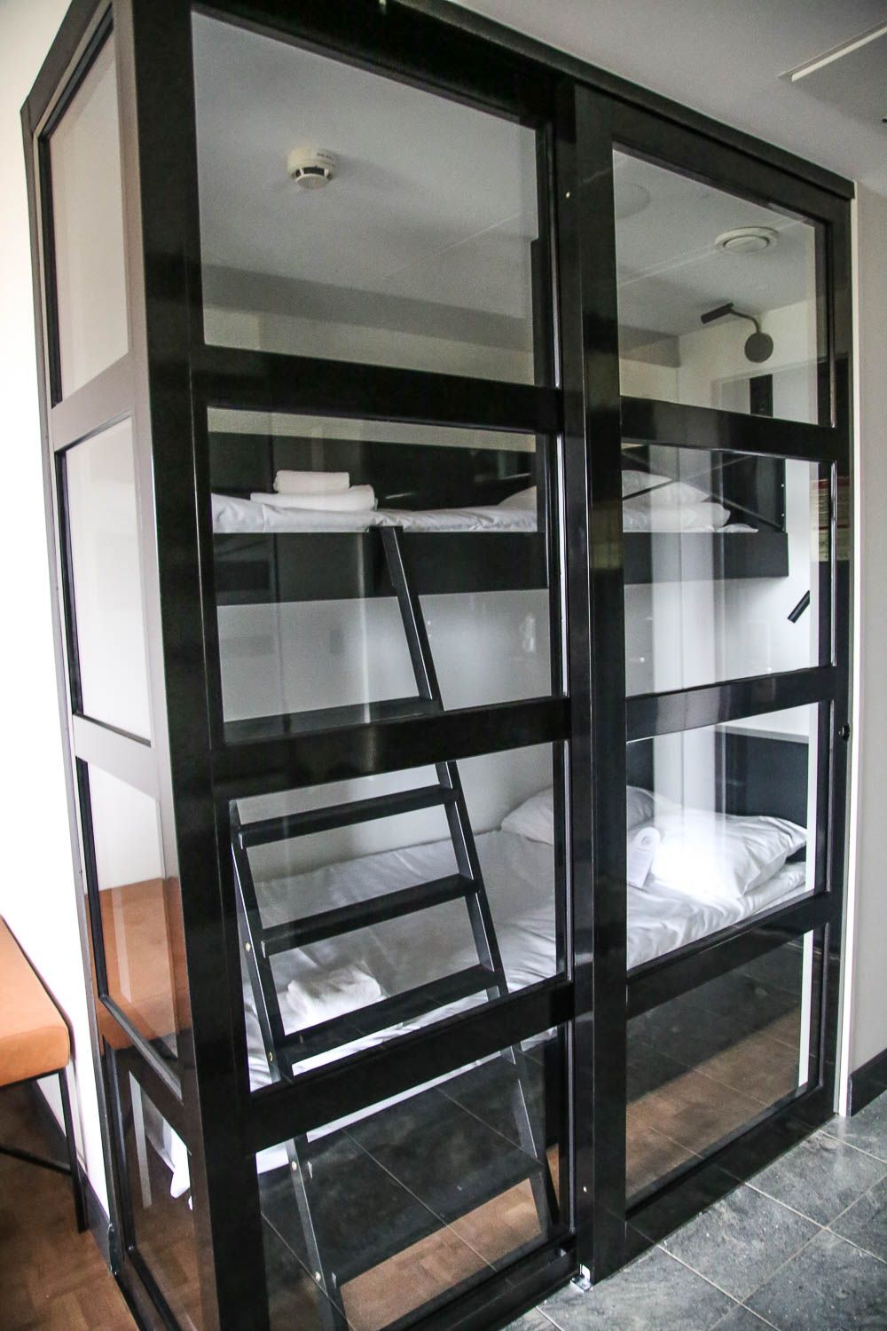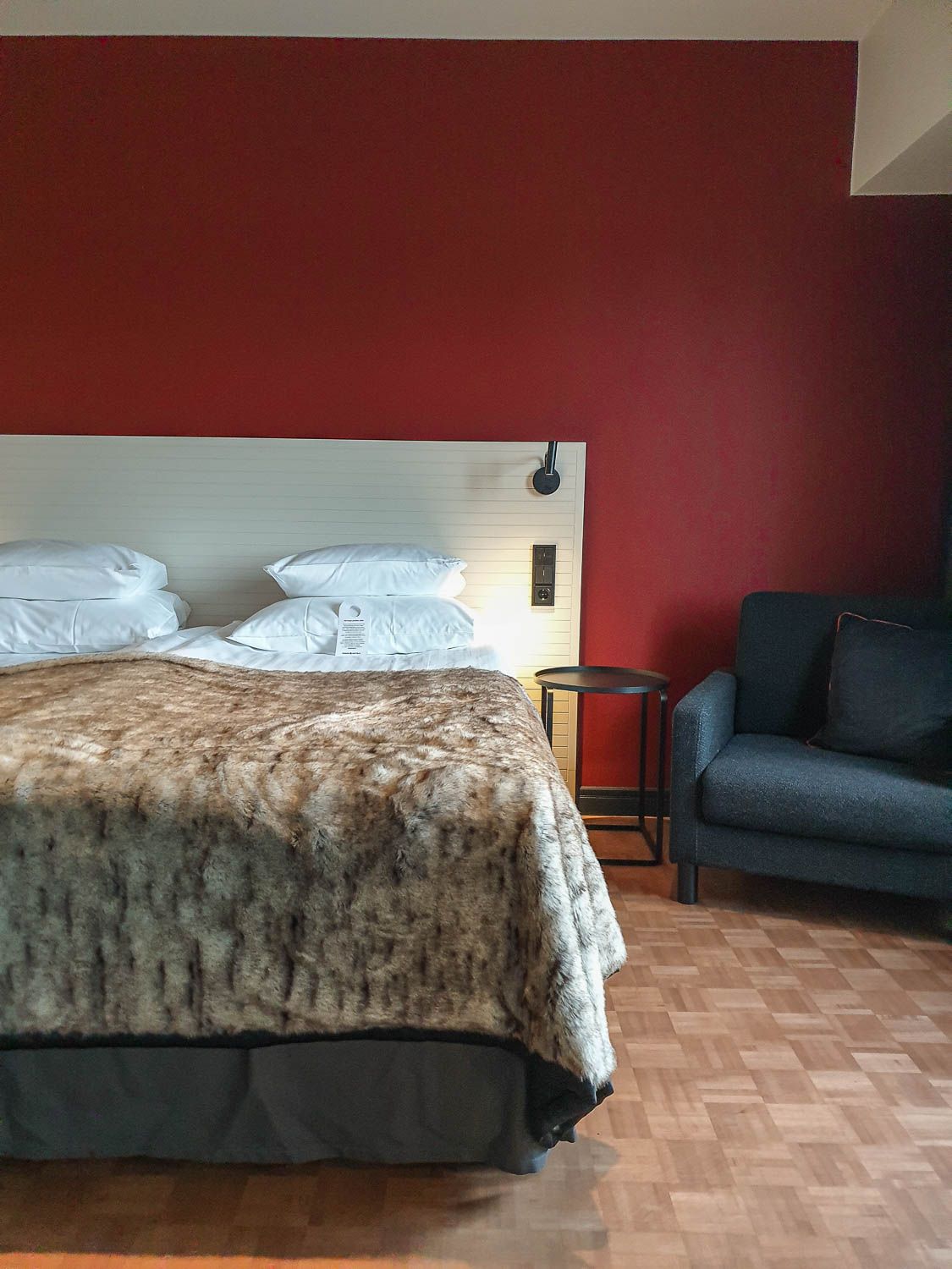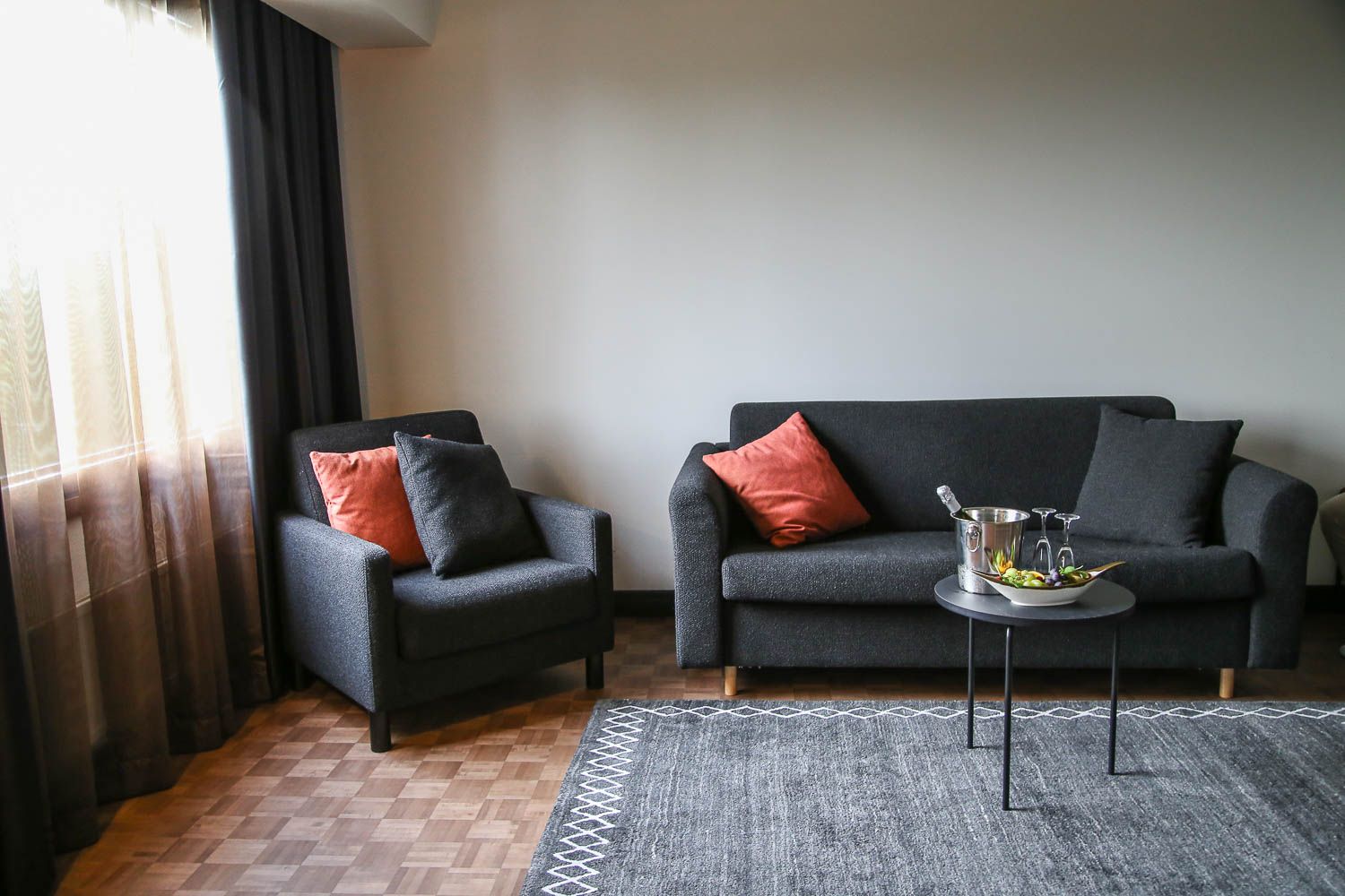 Kaupunkihotellien huoneet ovat yleensä ahtaita, mutta Kimmelin juniorisviitti oli todella avara. Oviaukko oleskelutilan ja makuuhuoneen välillä oli niin iso, että tila oli käytännössä melkein yhtä huonetta. Eteisen yhteydessä on pieni syvennys, jossa on minibaari, mutta meidän oleskeluaikana huone täydentyi vielä isolla jääkaapilla. Omia eväitäkin voi siis mukanaan tuoda.