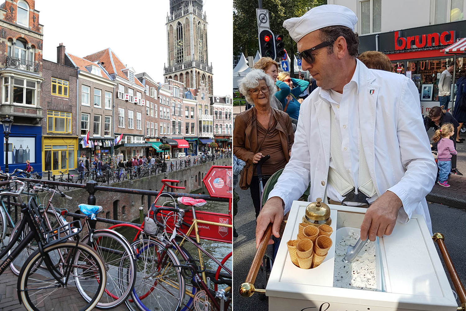 No juu. Ei menty. Syy: ihan mielettömän hurmaava pikkukaupunki, jossa ei ollut turisteja nimeksikään. Vuokrasimme polkupyörät, joilla oli kätevää ja nopeaa ottaa Utrecht haltuun viikonloppuloman aikana. Jos Amsterdamissa tsiljoonan fillarin härdelli on ajaa ihmisen välillä hulluksi, Utrechtissa liikenne oli huomattavasti rauhallisempaa. Ajelimme pitkin kanavien varsia, poikkesimme puistoihin ja sukkuloimme eri asuntoalueilla. Sunnuntaina päädyimme sattumalta keskelle kyläfestaria, jossa oli huikeita katusoittajia ja eräs varsin spontaani jäätelömyyjä: