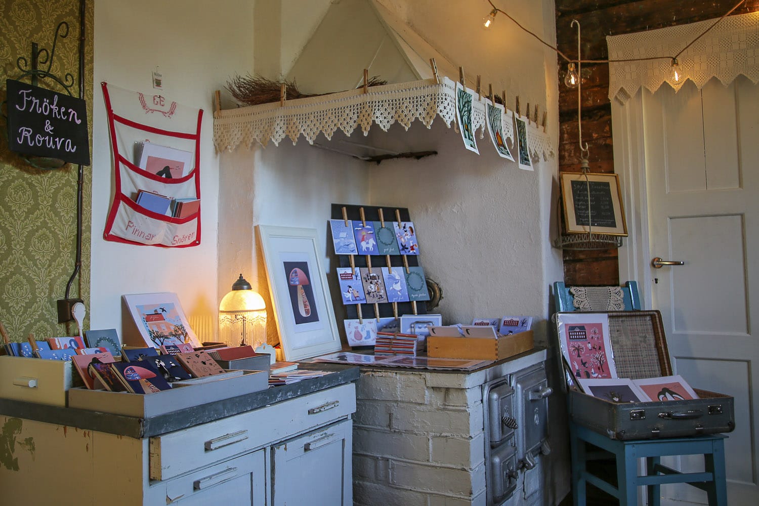 Sofia Koistinen pyörittää Taalintehtaan suloisinta pop up -puotia äitinsä Kirsi Koistisen kanssa. Hertsbölentien vanhassa puutalossa sijaitseva Fröken & Rouva on hurmaava kauppa, jossa on Sofian kuvittamia kortteja, muistivihkoja ja taulun kehyksiinkin sopivia printtejä. Kirsillä on puolestaan pettämätön vainu second hand -muodin suhteen, jota onkin puodin rekissä runsaasti. Lisäksi Fröken & Rouvassa on tarkoitus järjestää ennakkoluulottomasti tapahtumia: kesällä täällä pidettiin ristipistotyöpajaa ja piirustuskerhoa.