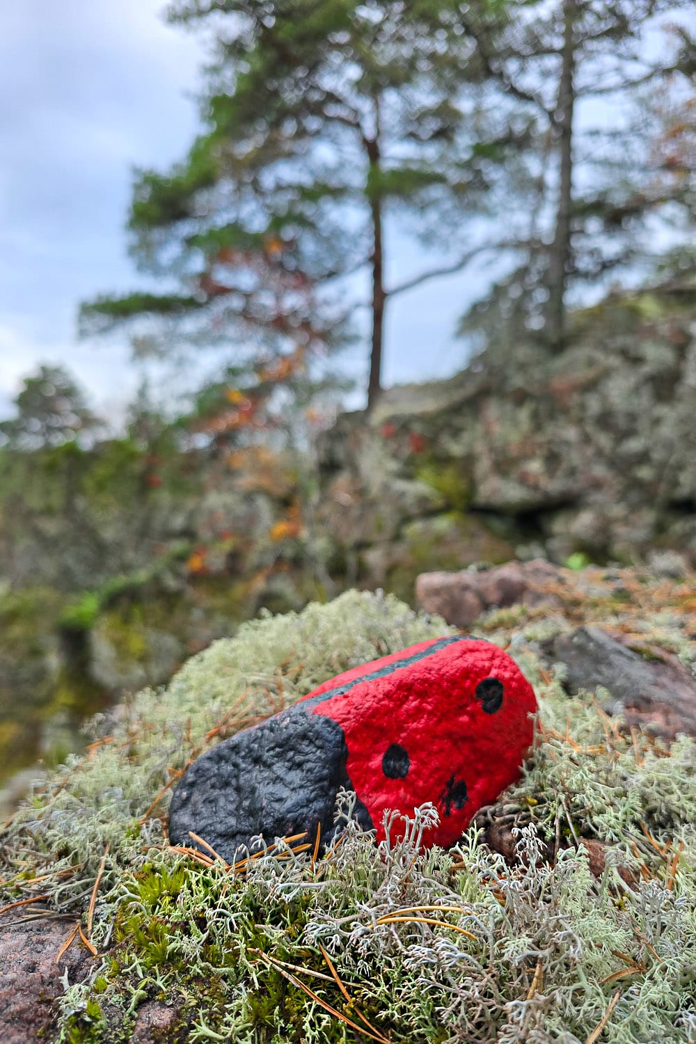 Kartanon pihapiiristä lähtevien patikointireittien määrä yllätti. Kipusin ensin kilometrin mittaista Leppäkerttupolkua jylhälle maisemapaikalle, josta avautui upea näkymä syksyiseen saaristoon. Tämä on muuten kiva reitti pienten lastenkin kanssa kuljettavaksi: polkua voi nimittäin seurata leppäkertuiksi maalattuja kiviä pitkin.