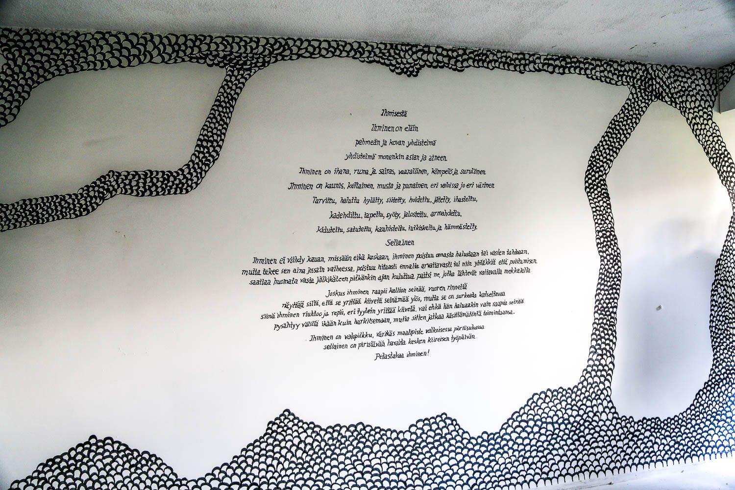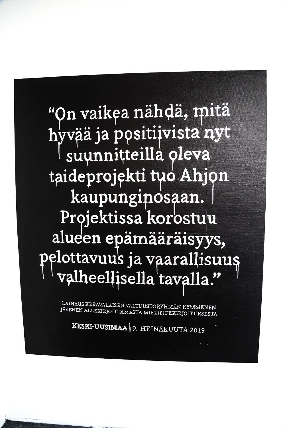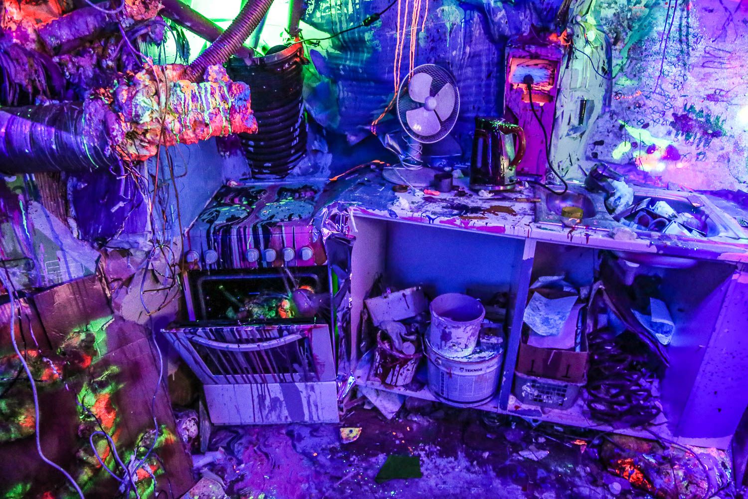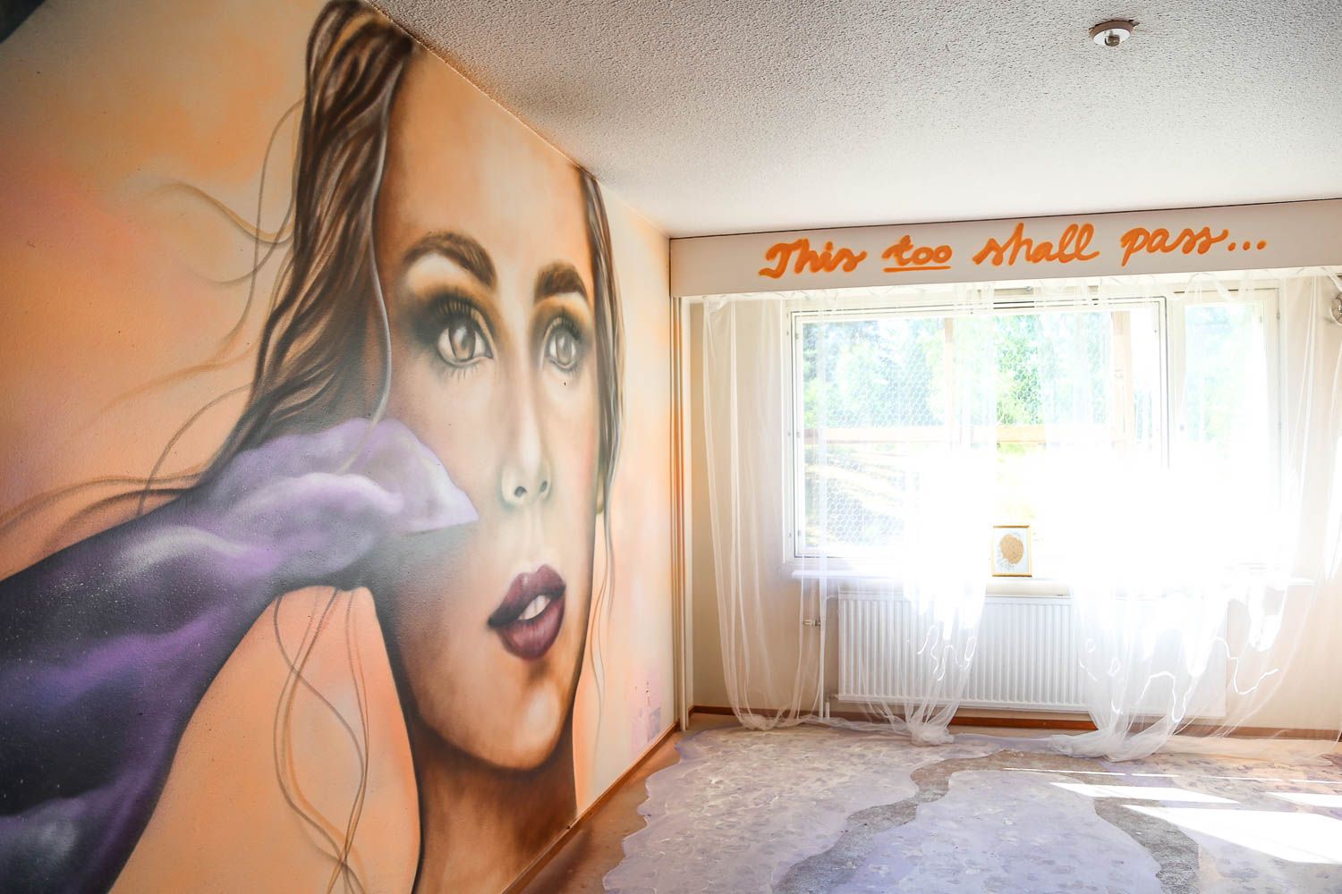 Jos et ole vielä kuullut, mistä on kyse, niin tässäpä informaatiota. Keravan Ahjossa (Moukaritie 4) sijaitsee kerrostalo, joka on niin huonokuntoinen, että se on saanut purkutuomion. Ennen lopullista kuolemaa talo sai kylään 94 taiteilijaa, jotka loivat sisälle elämysgallerian. Teosten kirjo on valtava: kaikkea löytyy uv-maaleilla tehdyistä graffiteista upeisiin muotokuviin ja installaatioihin saakka. Töitä on viidessä kerroksessa ja talon jokaisessa asunnossa.