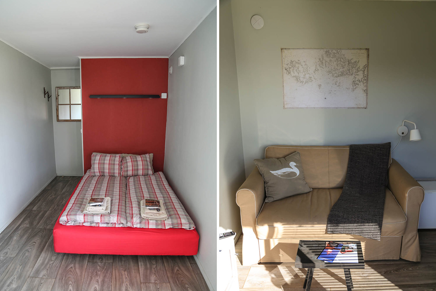 Sisältä mökit ovat kompakteja ja pelkistettyjä, mutta kaikki tarvittava löytyy. Ravintolan aamiainen kuuluu yöpymishintaan (98 € kahdelta).