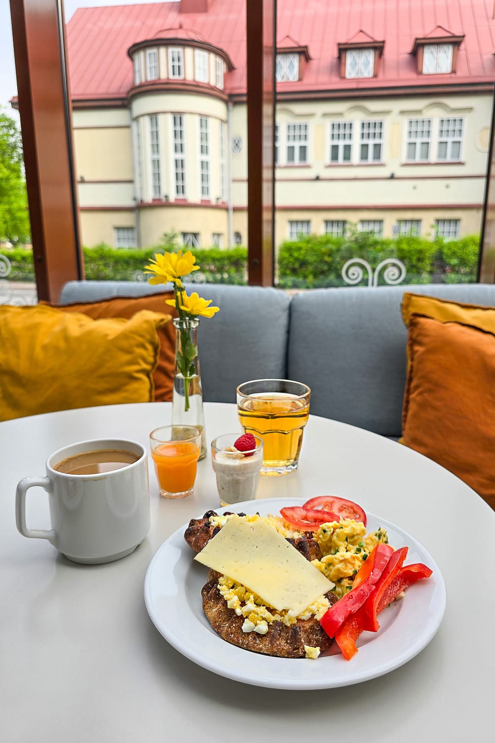 Olen sanonut tämän ennenkin, ja totean taas: hotelliaamiaisella ei tarvitse olla appeita 30 eri sorttia. Tärkeintä on, että raaka-aineet ovat laadukkaita, leipä tuoretta ja kahvi hyvää. Kiva lisä vielä on, jos mukana on muutama perusaamiaisista poikkeava juttu tai erityisen hyvin valmistettu perusherkku. Hotelli Lähteen aamiainen täytti juuri nämä kriteerit: karjalanpiirakat olivat lämpimiä ja voisia, munakas maukasta ja salaatit sekä tomaatit freesejä. Tarjolla oli myös puuroa, smoothieta, inkiväärishottia, mehuja ja jälkkäriksi pullaa ja keksejä. Mitäpä sitä muuta tarvitseekaan. Ikkunasta oli kiva ihailla kaunista kylpylärakennusta.