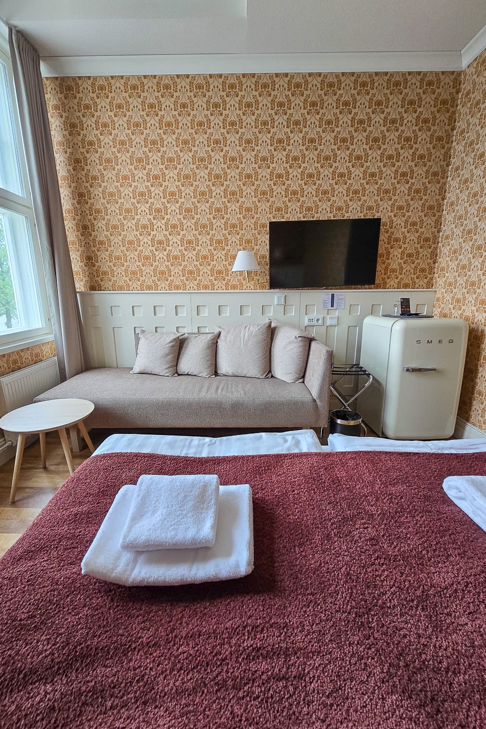Kylpylärakennus on kauttaaltaan kunnostettu, mutta siinä on säilytetty hurmaava vanha tyyli. Yövyin tässä Saimaa Double Deluxe -huoneessa, jossa oli muhkea parisänky, divaani, Smegin iso jääkaappi, työpöytä ja kylppäri/wc. Tilavuuden tuntua lisäsivät huonekorkeus ja isot ikkunat. Huoneen hinta on kesäkaudella 188 euroa, talvikaudella kympin halvempi. Aamiainen sisältyy hintaan, mutta jos varaukseen haluaa ottaa mukaan myös spa-käynnin, hinta nousee sesonkiaikaan 225 euron paikkeille. Eipä tämä ole silti mitään pääkaupunkiseudun summiin verrattuna.