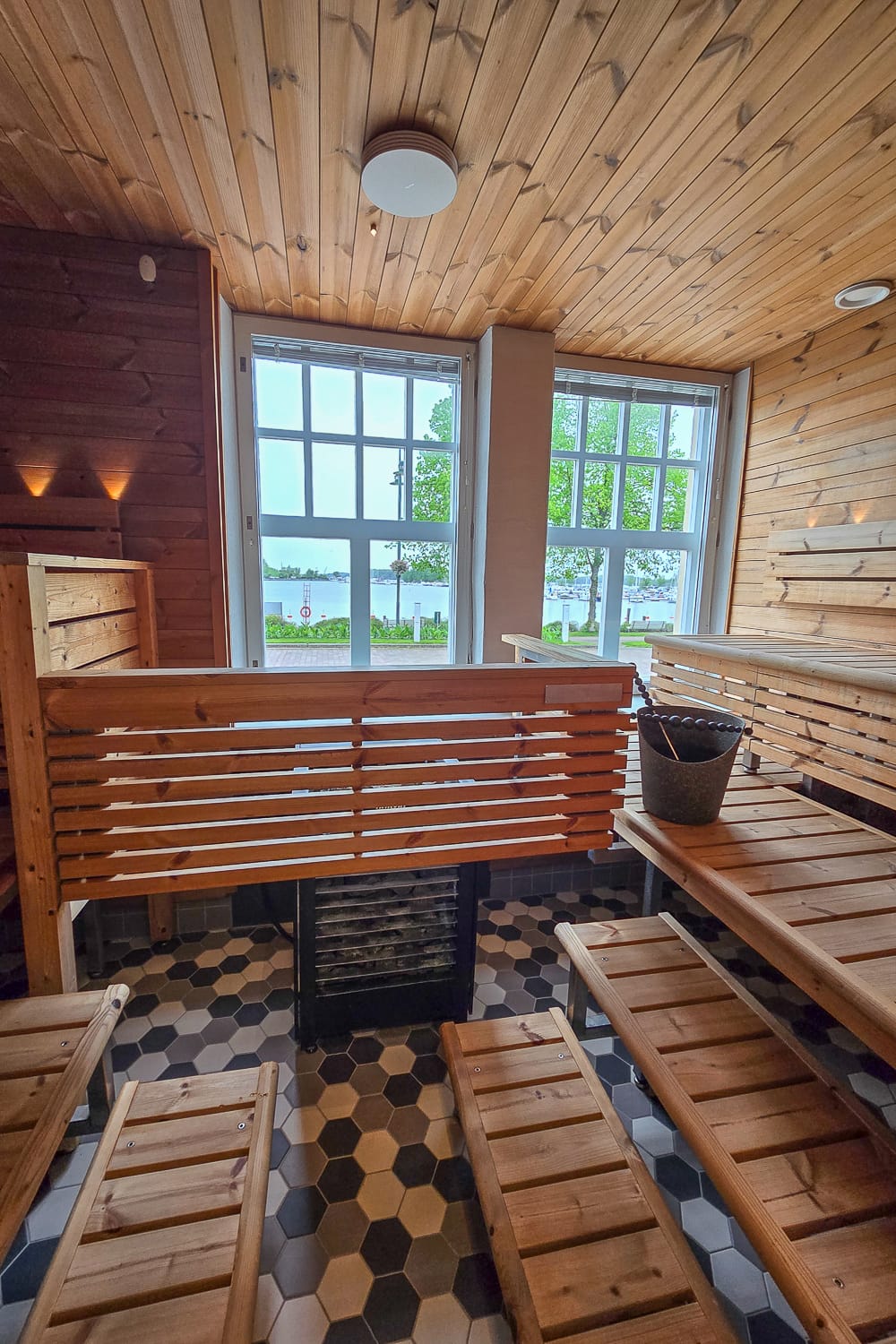 Kolmesta erilaisesta saunasta ehdoton lempparini oli tuo alakuvassa oleva Elämyssauna. Isoista ikkunoista voi seurata sataman ohikulkijoita ja saunan äänimaailma vie alkukesän luontoon: oli maagista istuskella lauteilla yksin ja kuunnella satakielen laulua ja käen kukuntaa.