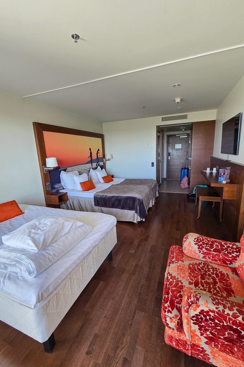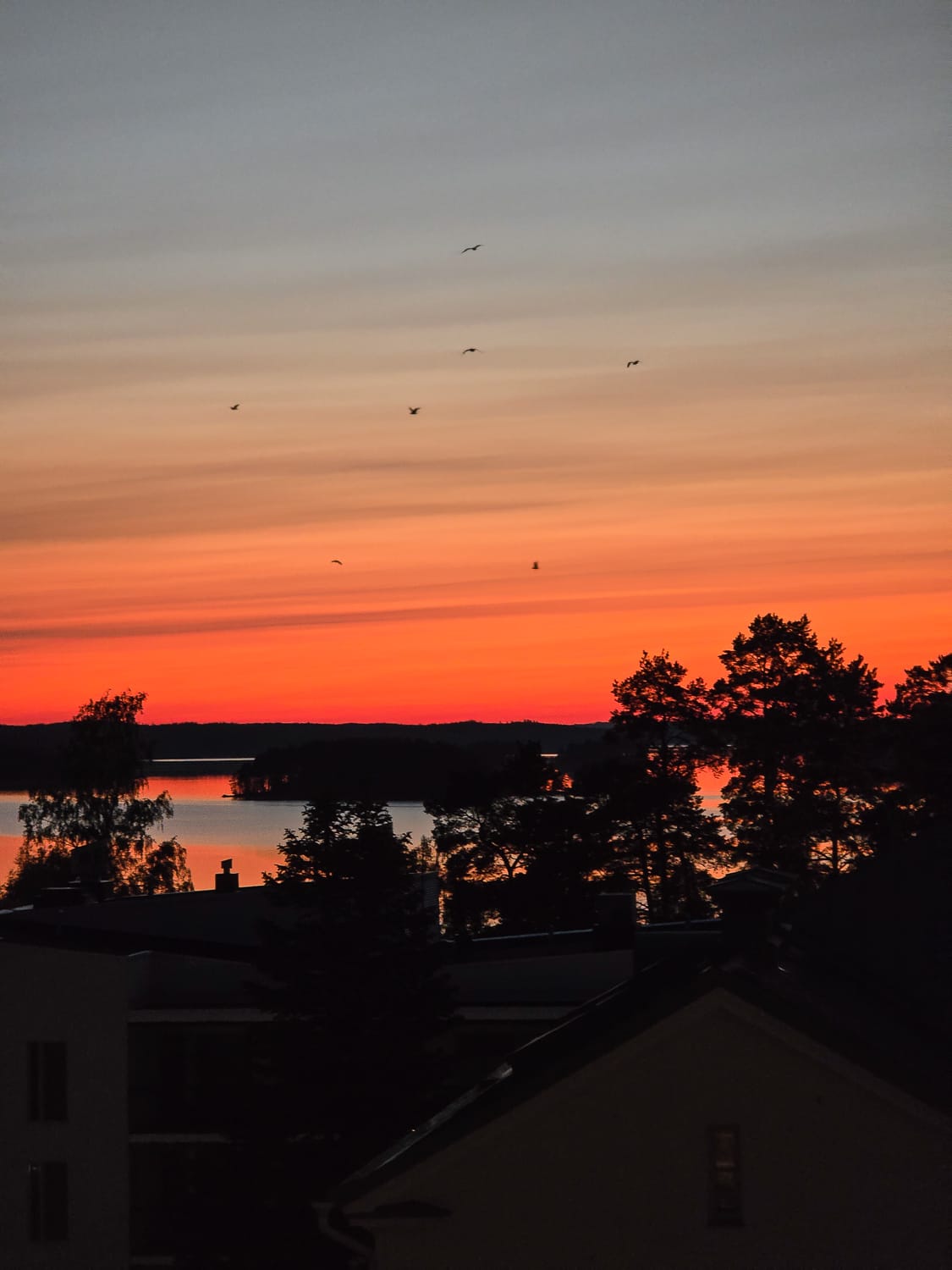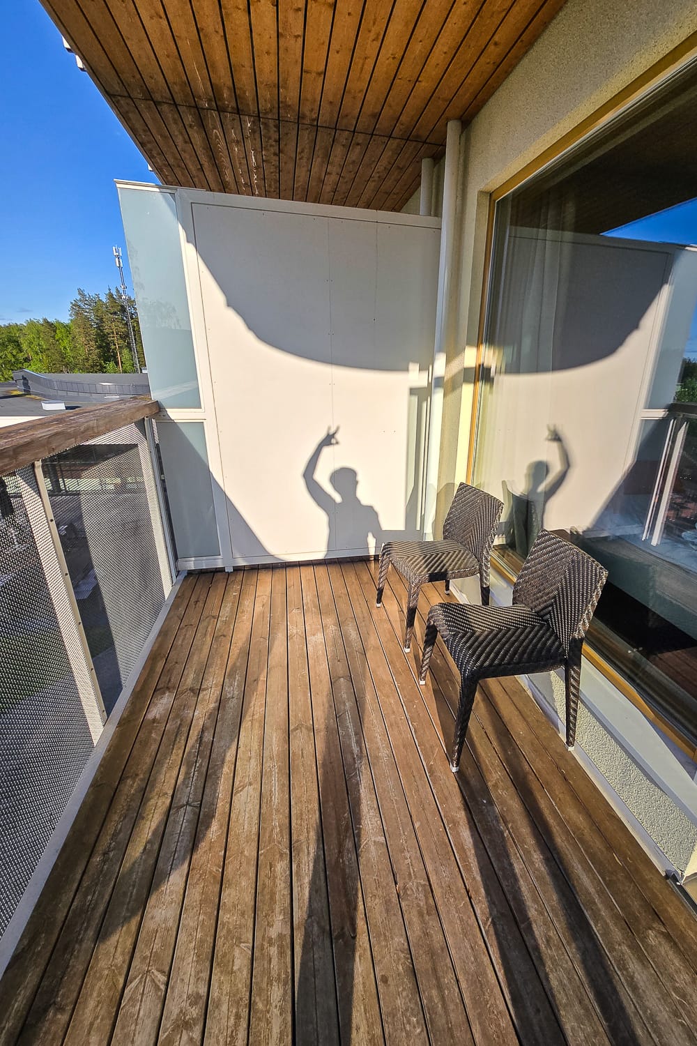 Yövyin hotellin päärakennuksessa 28-neliöisessä standard-huoneessa. Tähän olisi mahtunut majoittumaan kolmekin henkilöä (tai aikuiset ja kaksi pientä lasta), sillä huoneessa oli parivuoteen lisäksi lisäsänky (120 cm leveä, veikkaisin). On muuten harvinaista herkkua, että suomalaisessa hotellihuoneessa on parveke. Innostuin partsista ja ilta-auringosta niin, että kävin lopulta hakemassa noutoruokaa ja söin sen täällä. Pöytä olisi tosin vielä parantanut illalliskokemusta. Nyt piti hiukan taiteilla kahden tuolin kanssa, mutta kestin sen kuin nainen, sillä edessä avautuva oranssinpunainen auringonlasku hyvitti kaiken.