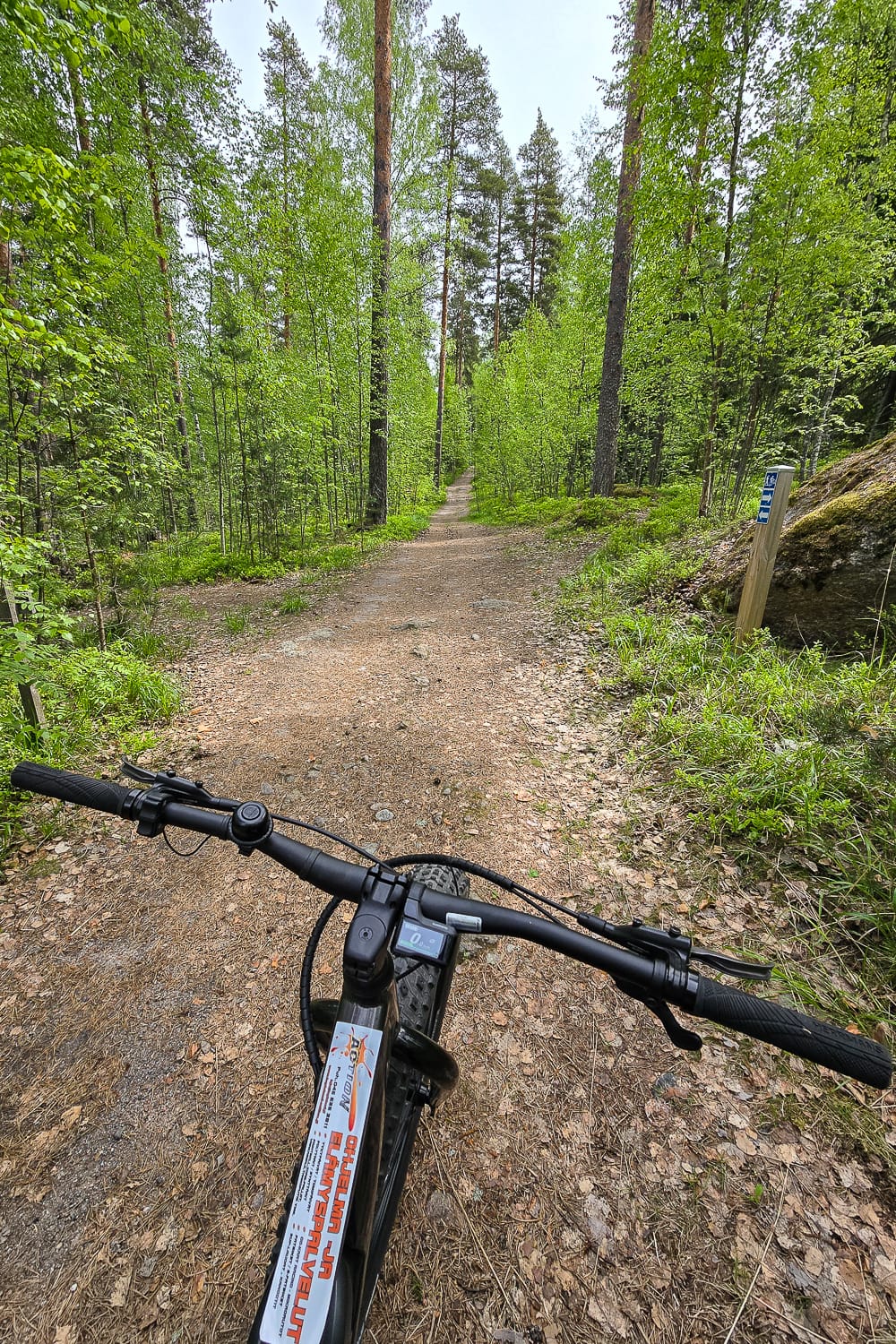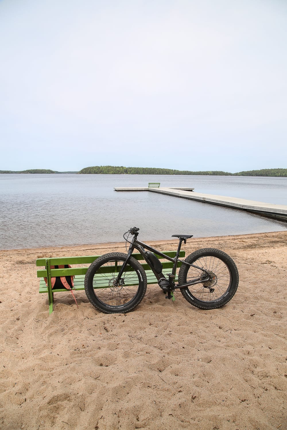 Itse buukkasin tunniksi E-fatbiken ja lähdin tutkimaan lähitienoon metsäpolkuja. Ensin tuli valittua turhankin vaativa reitti, jossa lällärinä taluttelin jyrkimmät osuudet. Lopulta päädyin ajelemaan tasaisempia metsäpolkuja Imatran Ukonniemeen ja löysin pettämättömällä suuntavaistollani vahingossa Lempukan uimarannan.