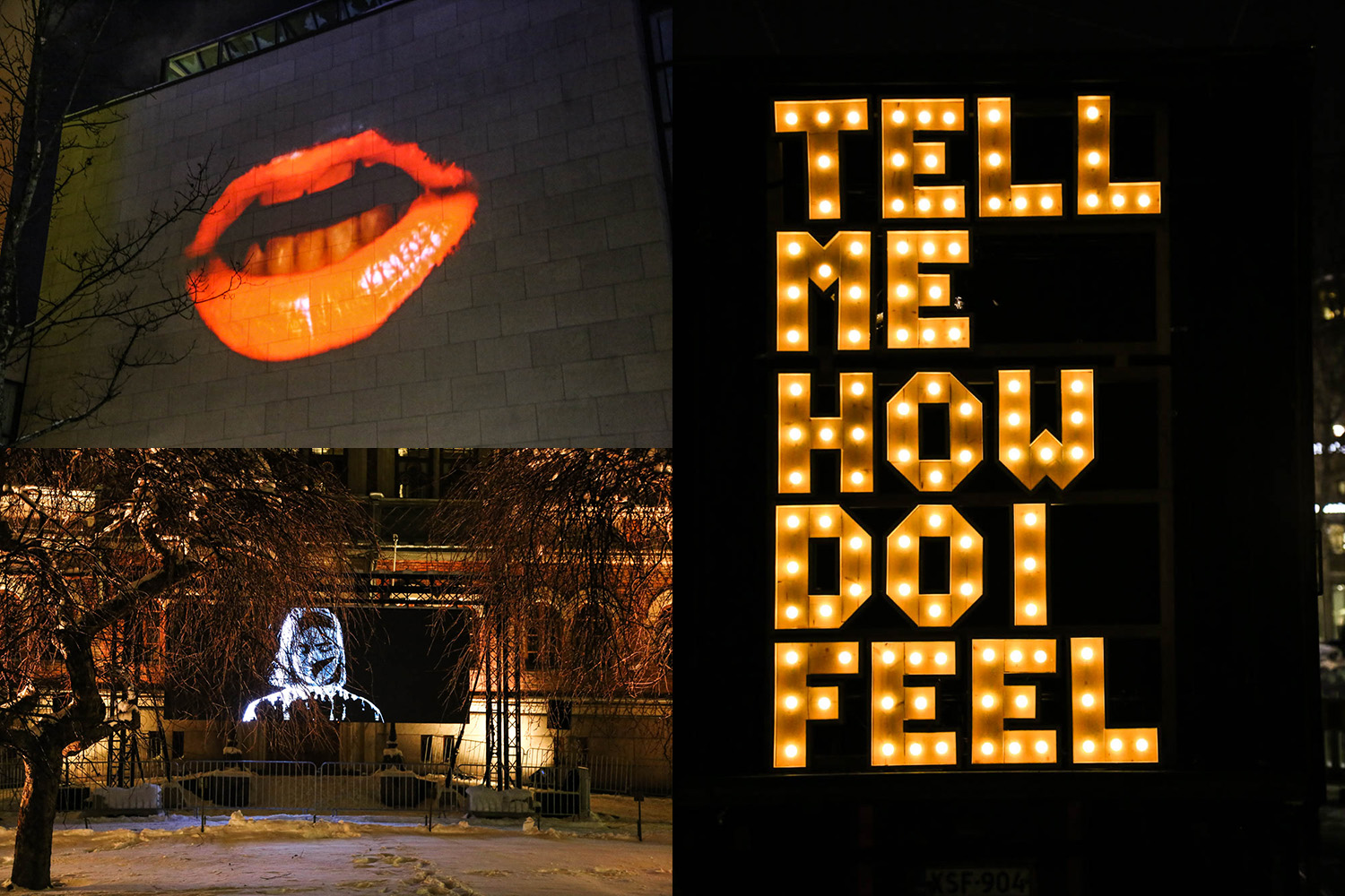 Tässä teoksessa kaikki vain napsahtaa kohdalleen! Jo Alvar Aallon vuonna 1962 suunnittelema rakennus on mielettömän herkullinen lähtökohta valoleikille. Kahdelle isolle seinälle projisoitu, musiikilla höystetty animaatio on hypnoottista katsottavaa. Värit ja kuviot heijastuvat mahtavasti myös mereen ja jäälautoille. Mikä parasta, tämänkin huikean teoksen takana on kotimainen tiimi: Pekka Tavi, Mikko Kunnari ja Timo Yliräisänen.