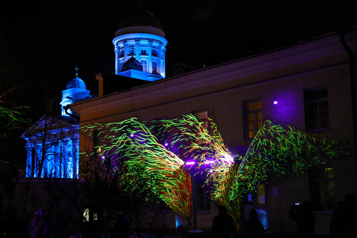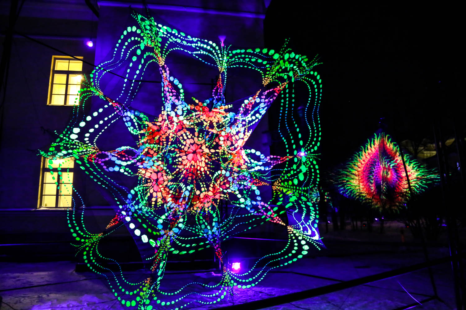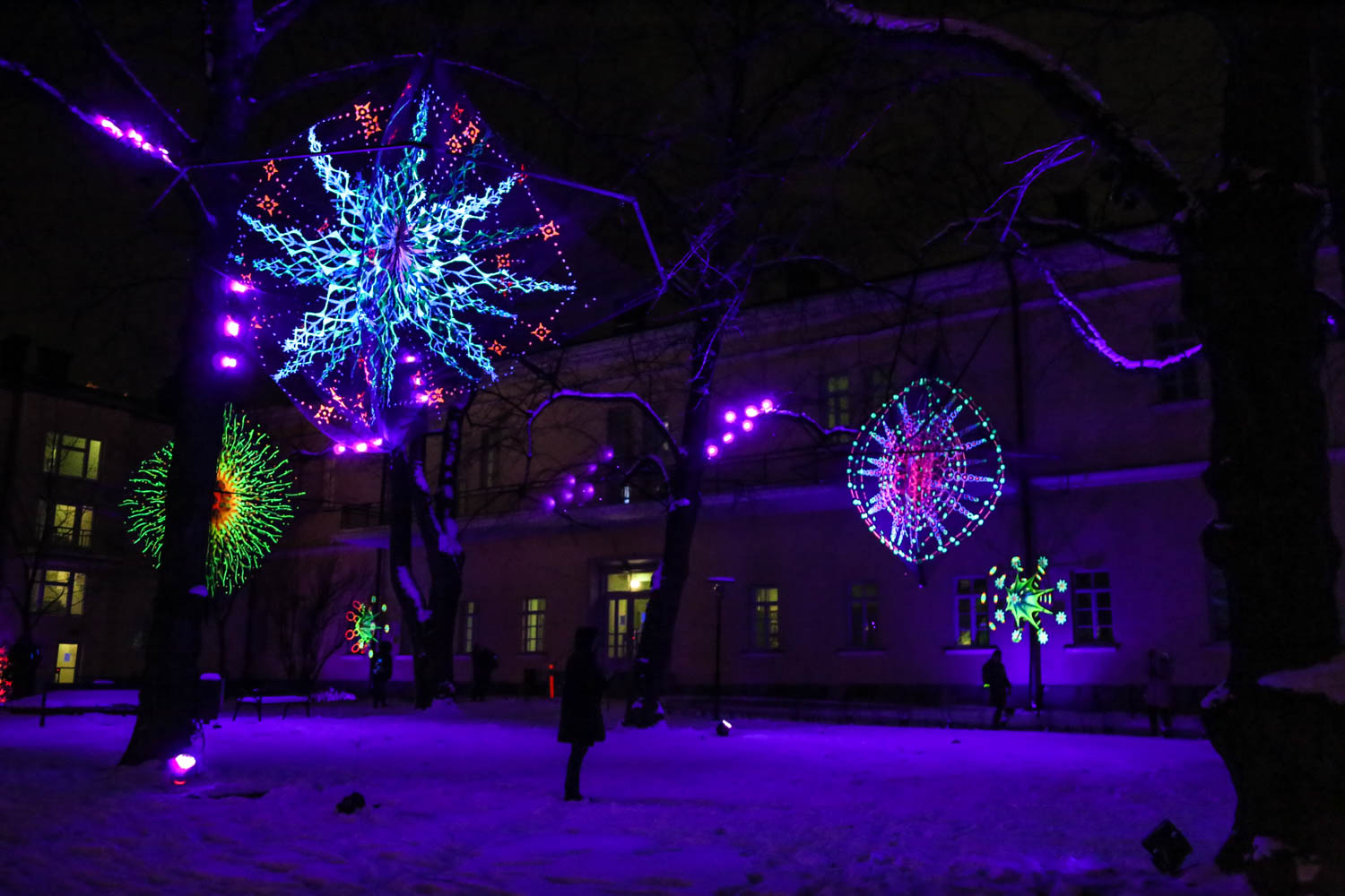 Pilkkopimeällä sisäpihalla tuntuu kuin sukeltaisi mystiseen taikametsään. Koko piha on täynnä UV-valoa heijastavia kolmiulotteisia kuvioita, jotka heiluvat hiljaa tuulessa. Fiilis muuttuu joka kerta riippuen siitä, mistä suunnasta teoksia katsoo. Kokonaisuuden on toteuttanut suomalainen Flowers of life -kollektiivi, jonka töitä on nähty 23 eri maassa (Suomessa mm. Konemetsässä ja Linnanmäen valokarnevaalissa).