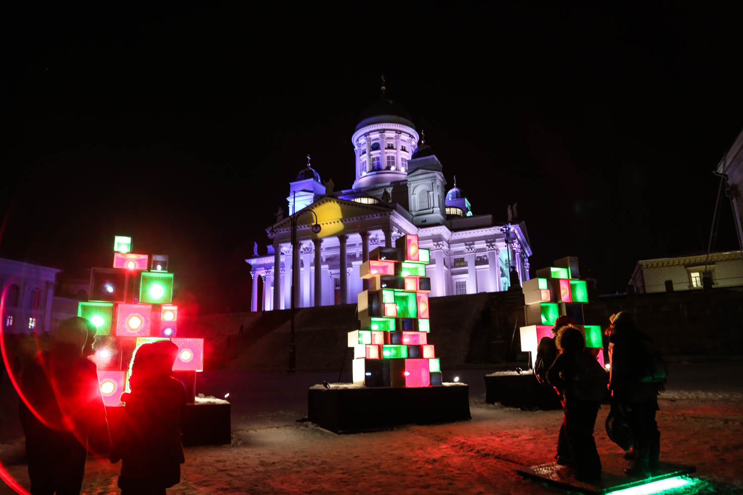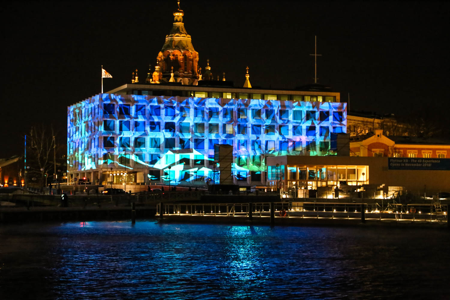 Kauppatorin julkisivujen valaiseminen oli Lux Helsingin porukalta loistoidea. Voin vain kuvitella, kuinka hienolta tämä väriloisto näyttää sataman isoista risteilylaivoista katsottuna.