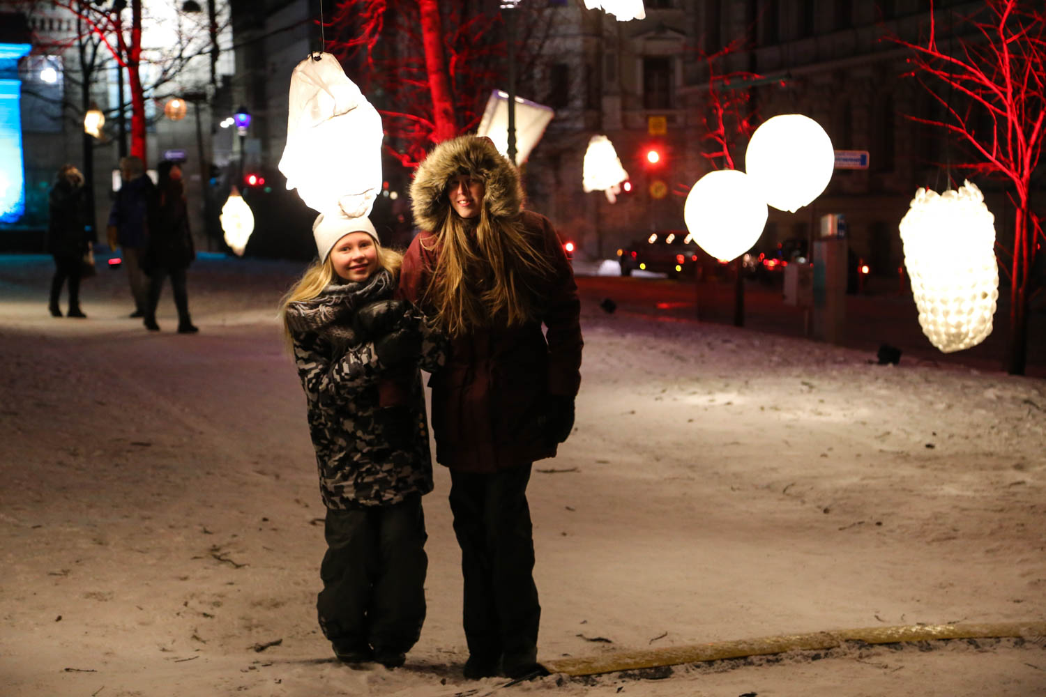Kyllä. Siellä oli jäätävän kylmä. Kohmeiset sormet ja varpaat olivat silti pieni hinta tästä loistosta. Tänä vuonna kaikki Lux Helsingissä vain loksahti kohdalleen. Valoteoksia ei ole enää ripoteltu ympäri kaupunkia, vaan keskitetysti ydinkeskustan paraatipaikoille. Valjut piperrykset on muutenkin unohdettu: valtaosa installaatioista on nyt näyttäviä kokonaisuuksia, joissa on hyödynnetty liikkuvaa kuvaa ja musiikkiakin. En tiedä sitten, olinko itse vain omituisissa sfääreissä, mutta vaikutuin. Mainio satumaailma pimeyden keskellä!