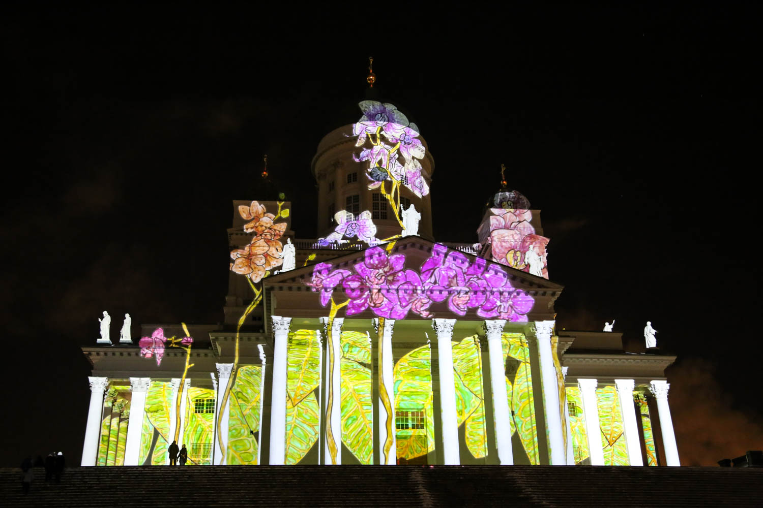 Tuomiokirkko oli viime vuonna pettymys, mutta nyt Senaatintorilla nähtiin ihana värileikki. Teoksen nimikin on osuvasti Ilon kuvia.