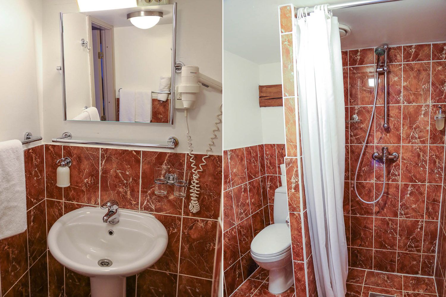 Ullakkohuoneen vessa voi muuten tehdä tiukkaa pidemmille vieraille. Laskeskelin, että suihkukopissa oli seisomakorkeutta alle 190 senttiä. Muuten suihku pelitti hyvin ja veden lämpötila pysyi tasaisena. Vessan varustukseen kuului myös fööni, pyyhkeet ja hyvät meikkausvalot.