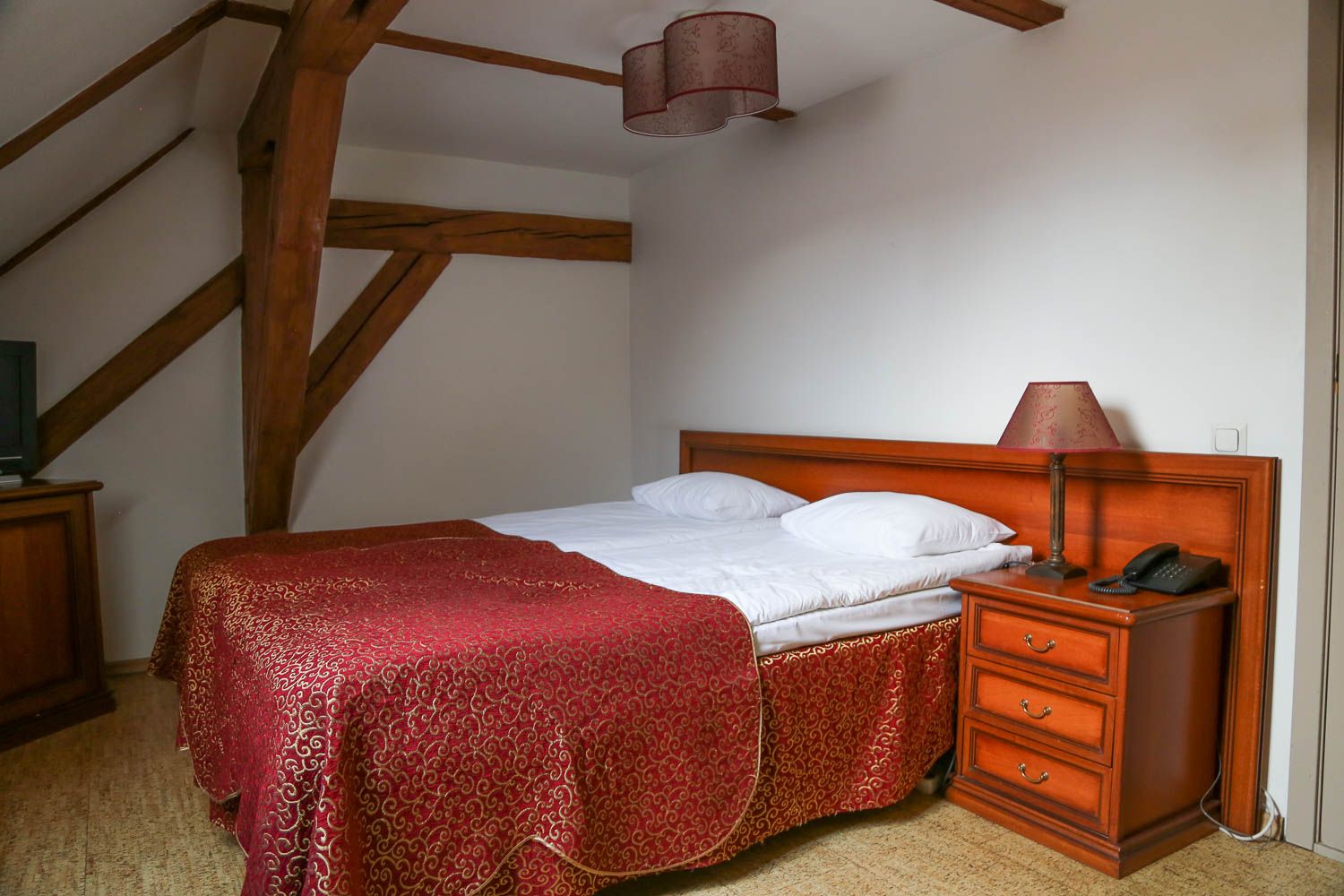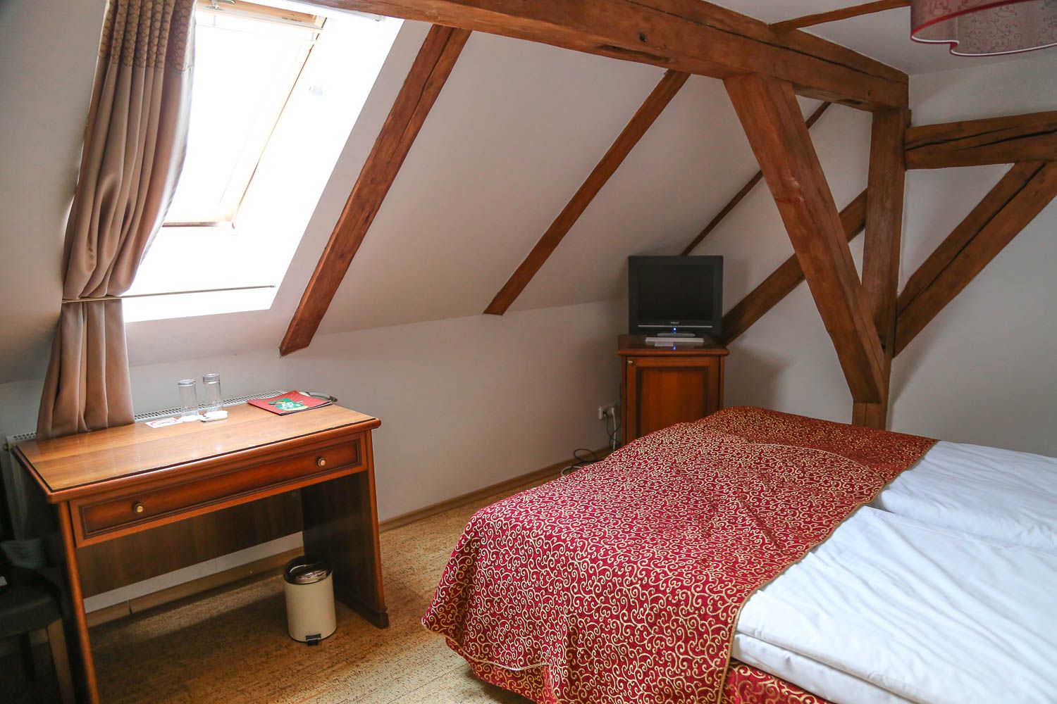 Majoituimme ullakkokerrokseen huoneeseen, josta oli näkymät vanhankaupungin kattojen yli. Huone oli aika pieni ja matalakin, mutta ehkä juuri siksi niin kodikas. Kattoikkunan sai raolleen niin, että huonetta pystyi halutessaan tuulettamaan. Jäimme miettimään, että onkohan täällä kovin kuuma kesähelteellä, sillä ilmastointia ei ole. Näin talviaikaan huoneen lämpötila oli kuitenkin täydellinen. Aamulla oli kiva herätä kirkonkellojen soittoon. Sänkyjen patjat olivat muuten todella hyvät, mutta tyynyjä olisi voinut olla muutama lisää.