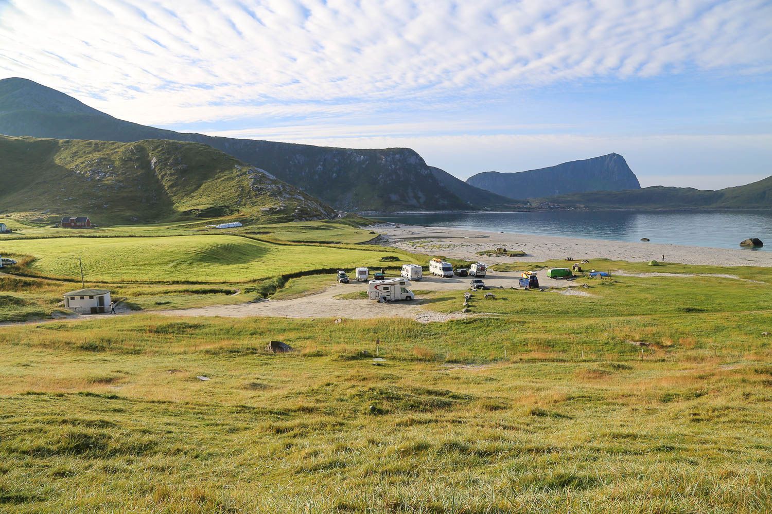 Lofooteilla matkailuauto toi tietenkin suurimman helpotuksen majapaikkojen valintaan. Elokuun lopussa leirintäalueilta ei tarvinnut varata paikkoja etukäteen, sillä aina löytyi tilaa. Keskimäärin autopaikka maksoi 30 euroa yöltä. Tuohon hintaan sai nauttia sähköistä, suihkuista ja vessoista. Norjan camping-alueet ovat siistejä ja niissä on usein myös pesukoneet ja ruuanlaittotilat, jotka tulevat tarpeeseen varsinkin telttailijoille.