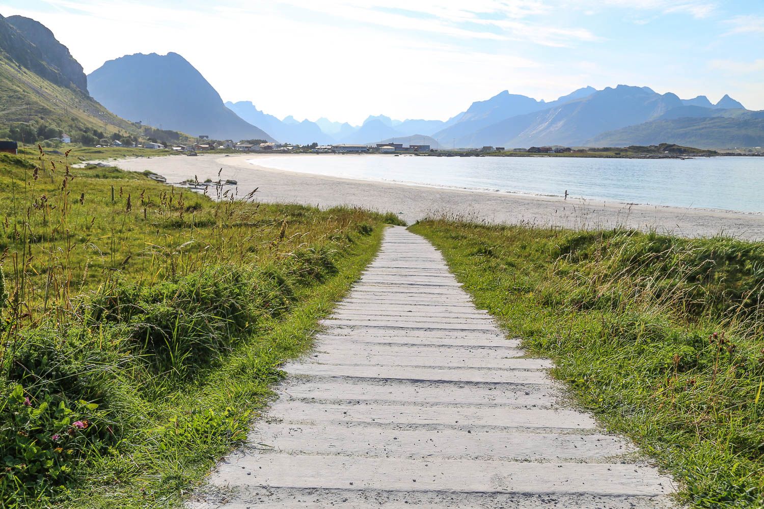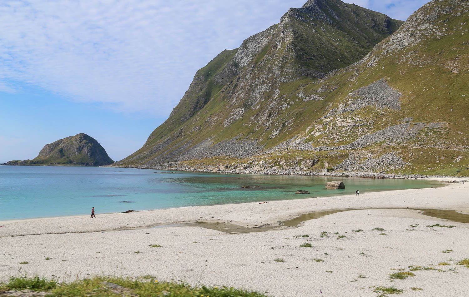 Useimmiten valitsimme majoituksen luonnon keskeltä, kuten Hauklandin jumalaiselta biitsiltä. Vitivalkoiset rannat ja turkoosinkirkkaat vedet ovat Lofoottien tavaramerkki. Maisema Hauklandissa oli niin epätodellisen kaunis ja tunnelma rauhallinen, ettei sitä oikein muuta osannut kuin ihmetellä näkymää häkeltyneenä. Aamulla heräsimme rinteillä laiduntavien lampaiden kellojen kilkatukseen.