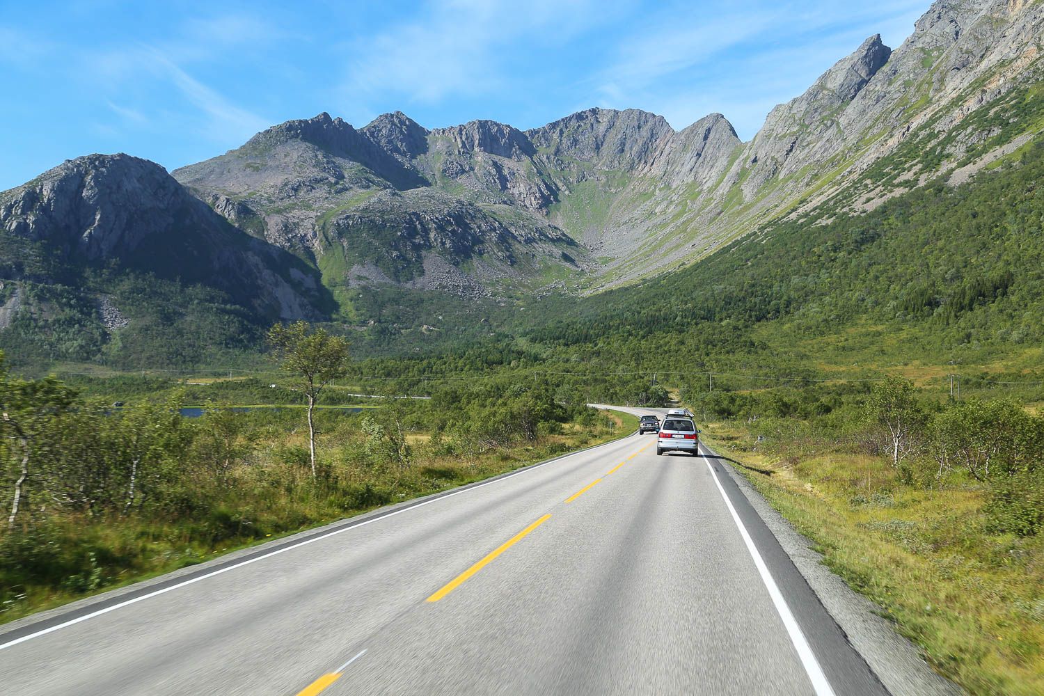 Pelkäsin etukäteen, että Lofooteilla odottaisi joku rotkon reunalla kulkeva serpentiinitie, mutta hyväkuntoinen E10 kulki valtaosan matkasta laaksossa tai meren äärellä. Kuudelle hengelle rekisteröityä Fiat Argoa sai ajaa ihan henkilöautokortilla.