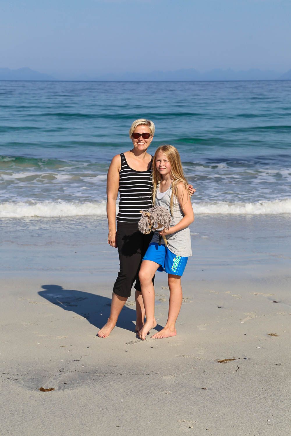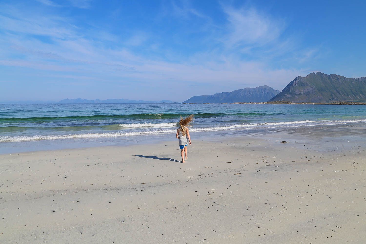 Onhan tämä hämmentävää. Kirmata pitkin autiota rantaa. Gimsøysandissa oli vielä vähemmän väkeä kuin Hauklandissa. Merivedellä lämpöä vain 15 astetta, mutta sehän ei uimista rakastavia lapsia hidastanut. Tiedän, että meille osui poikkeuksellisen hyvä tuuri säiden suhteen: yleensä Lofooteilla saa myös kesäaikaan varautua tuulen- ja sateenkestävillä vaatteilla.