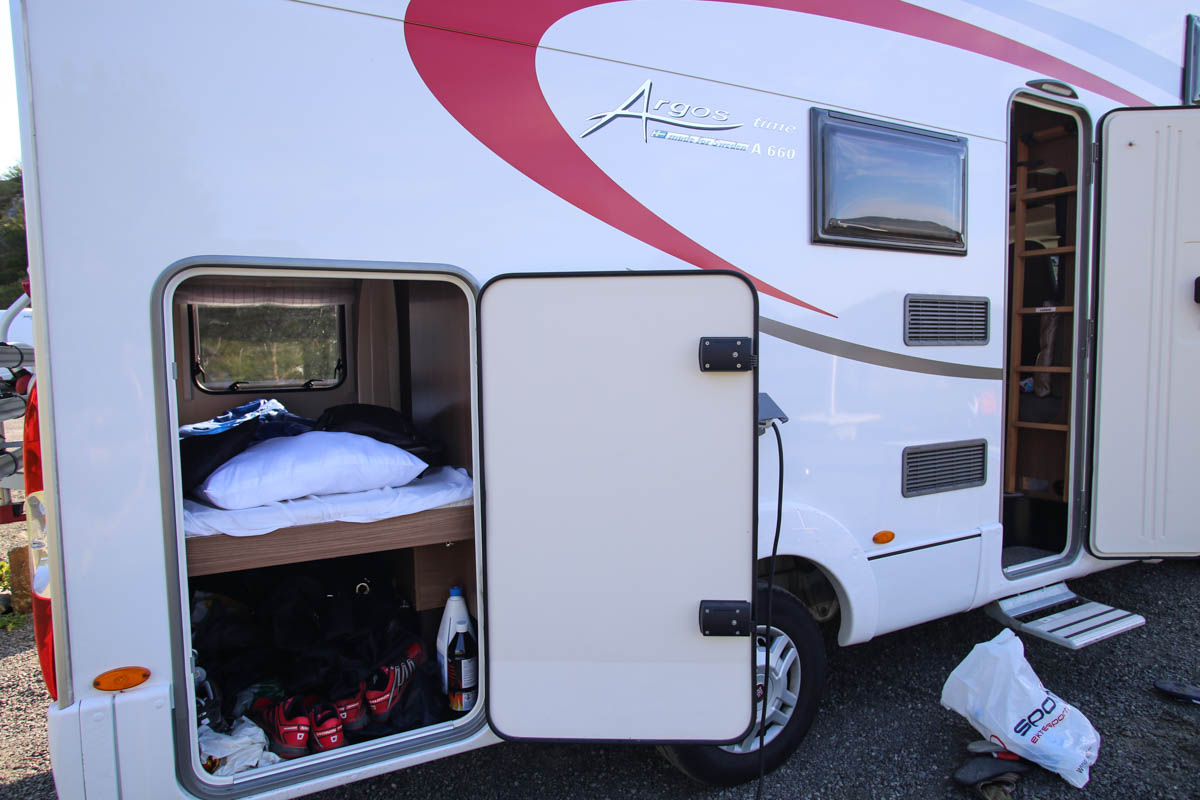 Vuokraamamme Fiat Argos oli rekisteröity kuudelle hengelle, mutta kyllä neljä on mielestäni siihen maksimi. Näin keskiosan pöytää ei tarvitse venkslata edestakaisin: lapset nukkuivat ohjaamon päällä olevassa vuoteessa, me Timpan kanssa peräpään kerrossängyssä.