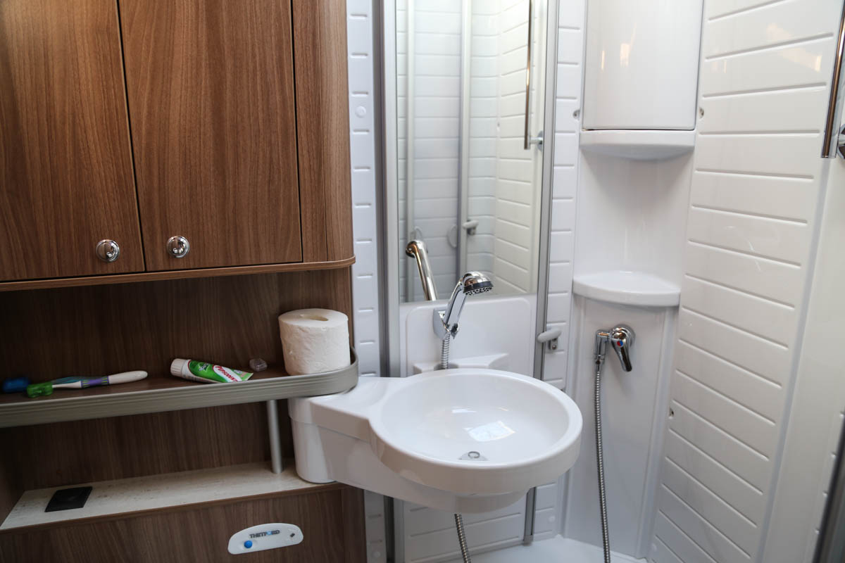 Säilytystila on matkailuautossakin tietysti haaste. Tavarat ovat aina "jonkin alla tai takana". Ehkä kokemus tekisi mestarin (niin varmaan!). Vastuualueiden jakaminen on näin pienessä tilassa elinehto. Timppa hoiti ajohommat, lapset retkikalusteet ja jääkaapin (ajon aikana virta akulle, parkissa kaasulle tai sähköpistokkeelle). Meikäläiselle jäivät kokkaushommat ja vessatankin tyhjennys (ei ollut niin paha nakki kuin aluksi pelkäsin). Jokaisella leirintäalueella oli septitankin tyhjennyspaikka, vedenottopiste, sekä viemäri harmaan veden laskua varten.