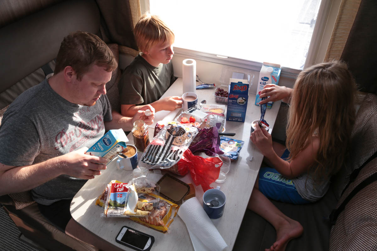 Vuokrasimme matkailuauton Rovaniemeltä, jotta ajomatka Lofooteille ei olisi niin tolkuttoman pitkä. Koska tarkoitus oli karsia kulut minimiin, hamstrasimme Prismassa kärryt täyteen helppoa, kaasuhellalla kokkailtavaa ruokaa. Petivaatteet toimme tullessamme, retkikalusteet, pienen matkagrillin ja navigaattorillisen tabletin vuokrasimme lisävarusteena.