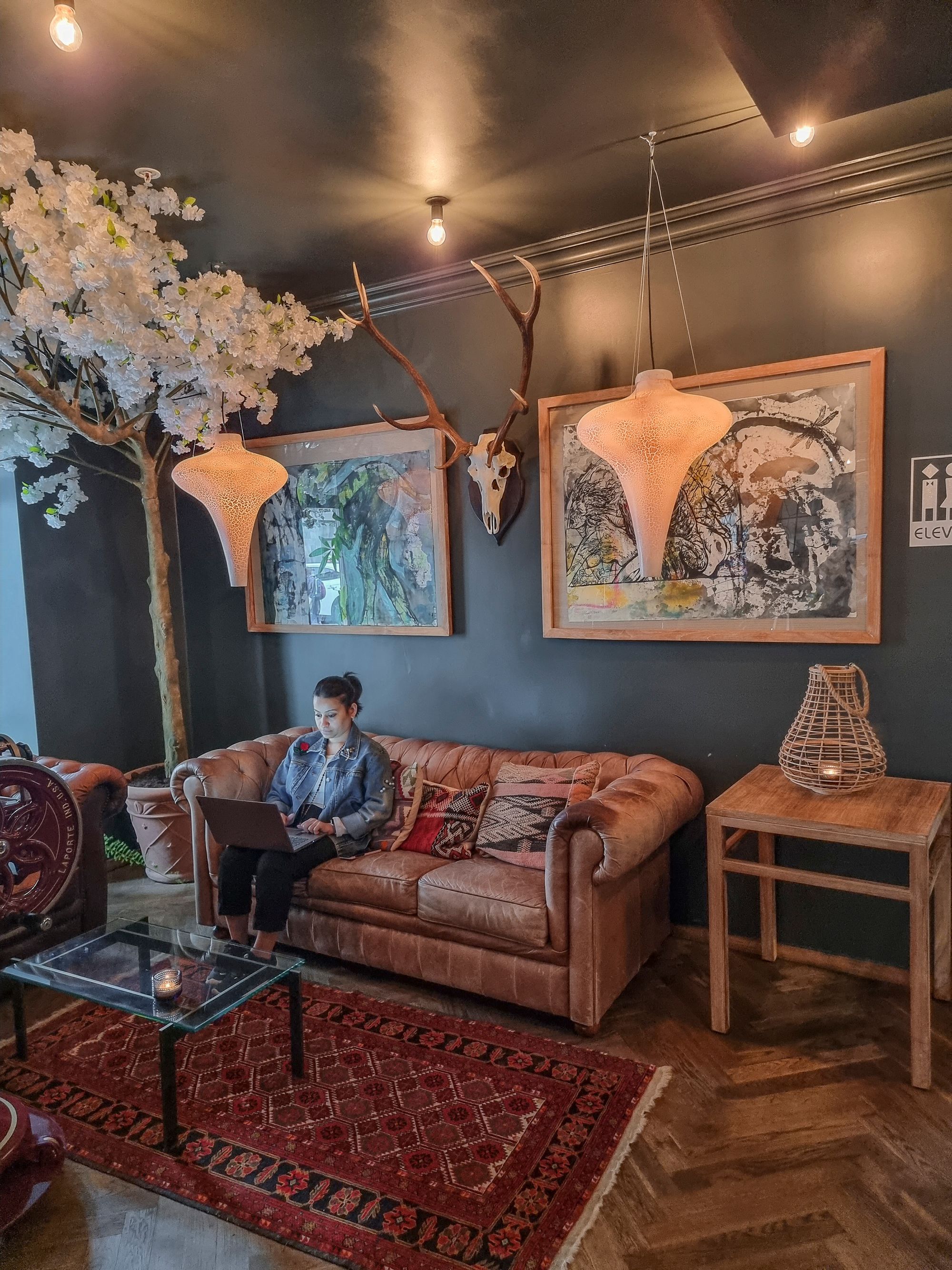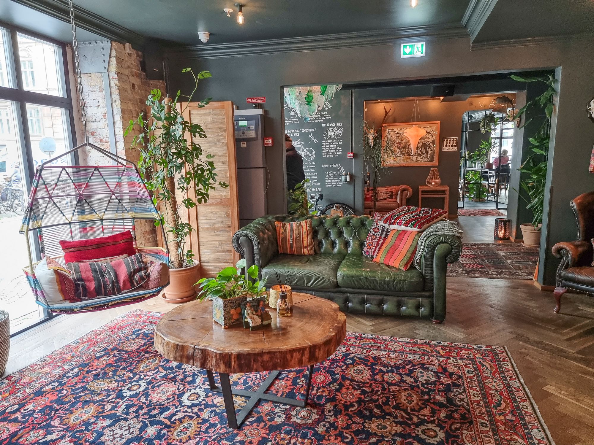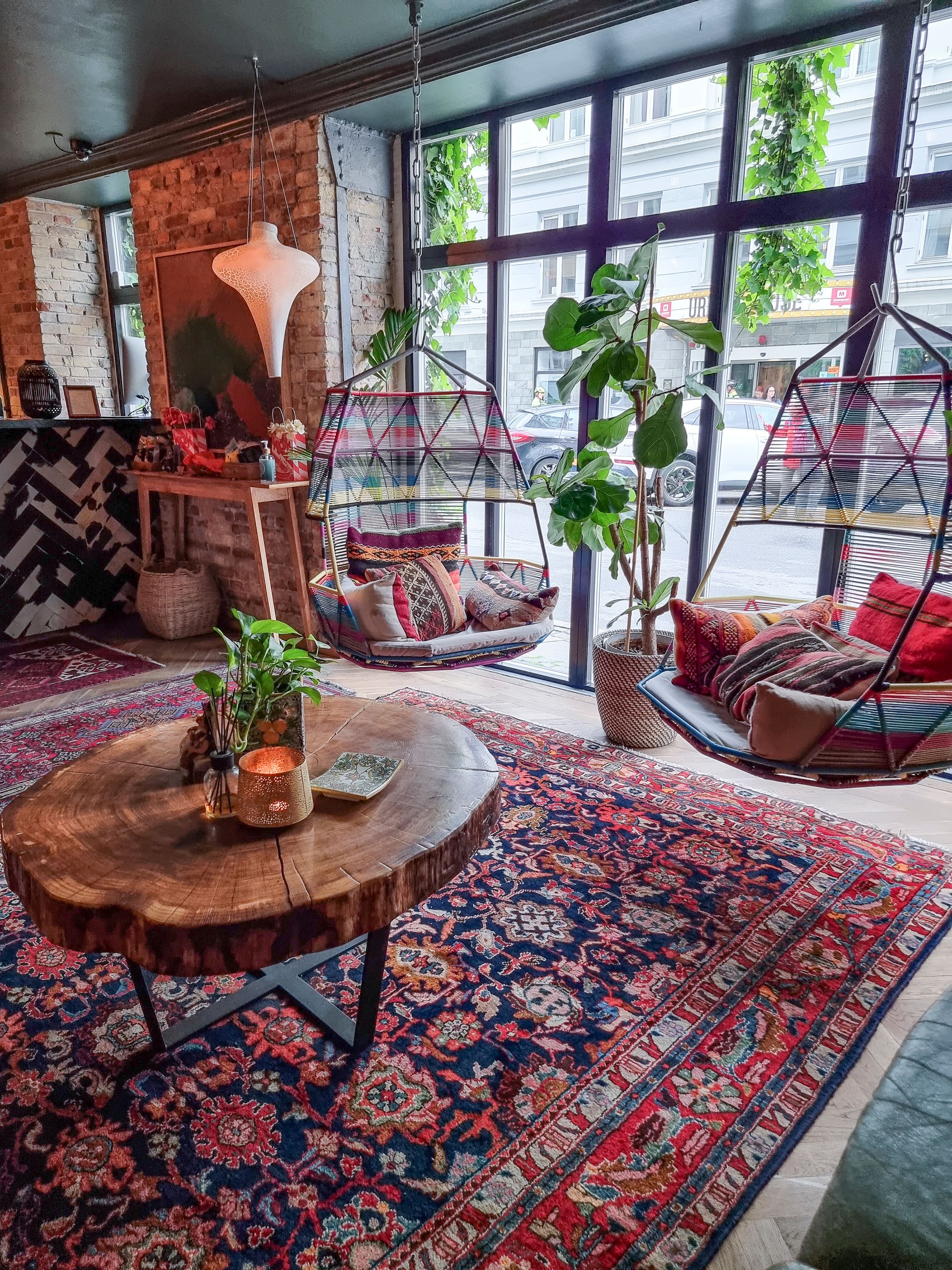 Jo Axel Guldsmedenin pieni aulatila johdattaa vieraan spesiaaliin tunnelmaan. Hotelli on harkiten ja rakkaudella sisustettu, värimaailmaltaan täydellinen vastakohta skandinaaviselle minimalismille. Riippukeinut ja lokoisat sohvat suorastaan pakottavat ottamaan iisisti ja hengähtämään hetkeksi.
