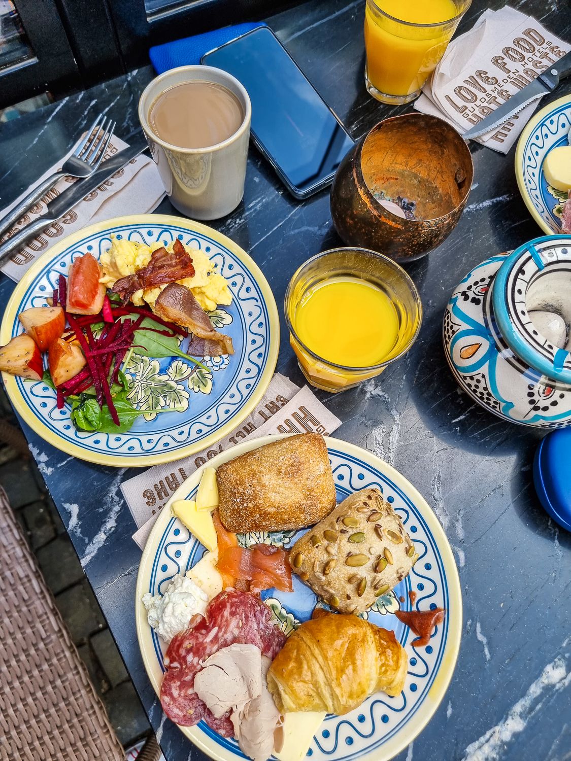 Aamiainen (27 e) ei tosin kuulunut huoneen hintaan, vaan se piti tilata ja maksaa erikseen. Tykkäsimme brekusta silti niin, että kävimme syömässä sen kahtena aamuna. Ja koska Kööpenhaminassa ymmärretään, että illat voivat venähtää, ihmisiä ei pakoteta raahautumaan aamiaiselle kukonlaulun aikaan. Appeita on tarjolla arkisin puoli yhteentoista ja viikonloppuisin jopa puoleenpäivään saakka.