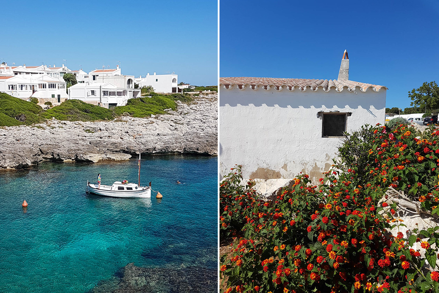 Meri oli niin turkoosinkirkas, että veneet ja uimarit tuntuivat leijuvan ilmassa. Tämä biitsi olikin Menorcan ihanin (lisää rannoista seuraavissa postauksissa).