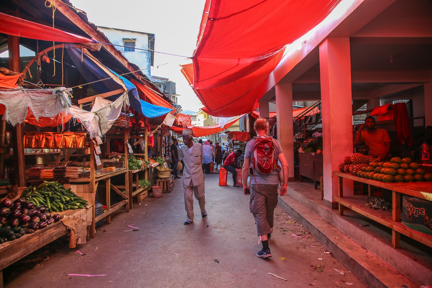 Katosten suojassa oleva Stone Townin basaari on huima paikka. Toripöydät notkuvat vihanneksia, hedelmiä, kalaa ja värikkäitä maustepusseja, joissa on muun muassa currya, inkivääriä, kanelia ja pippuria. Ostin ison nyssäkän mausteita 5 dollarilla tingittyäni hinnasta ensin noin puolet.