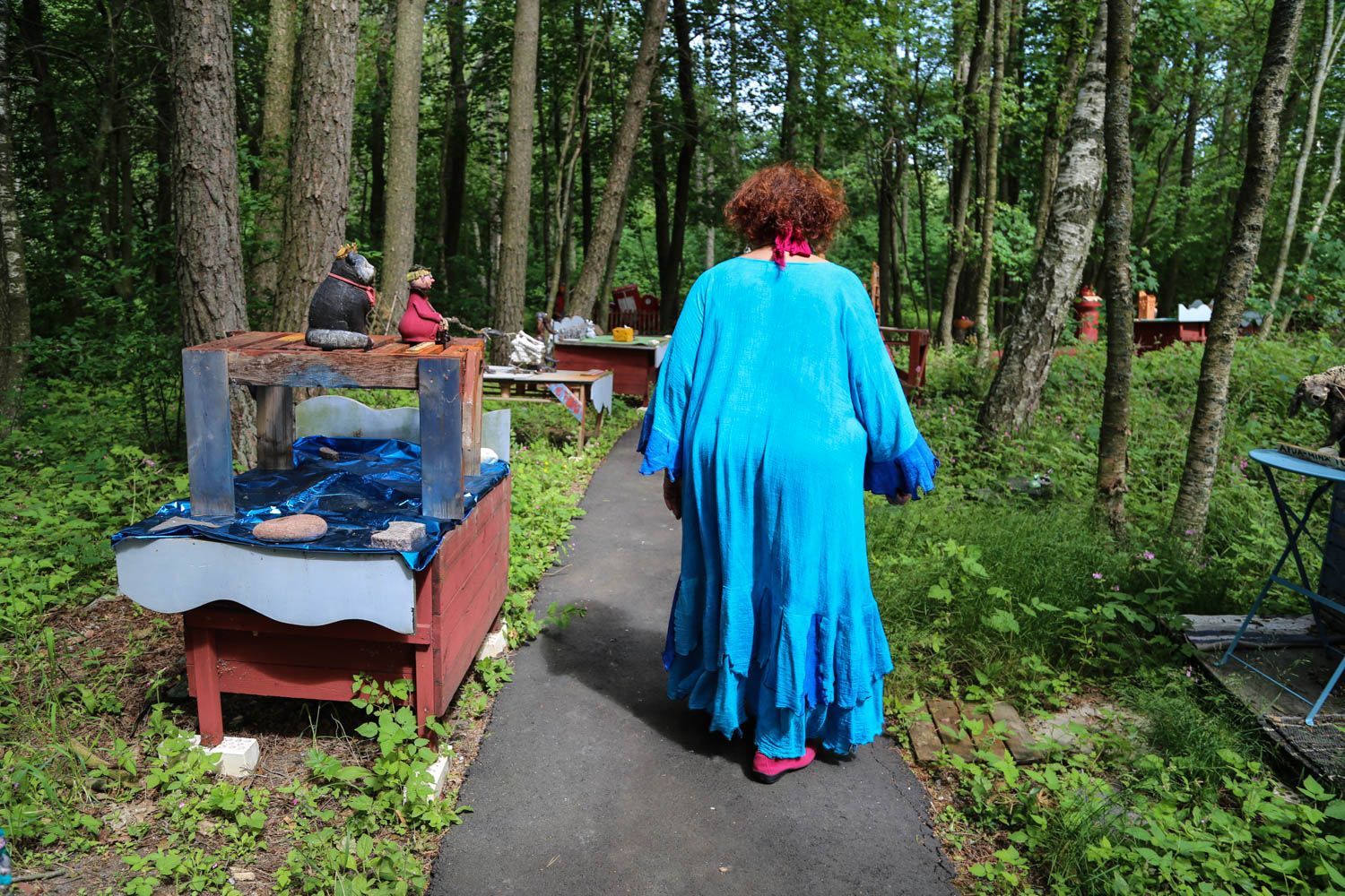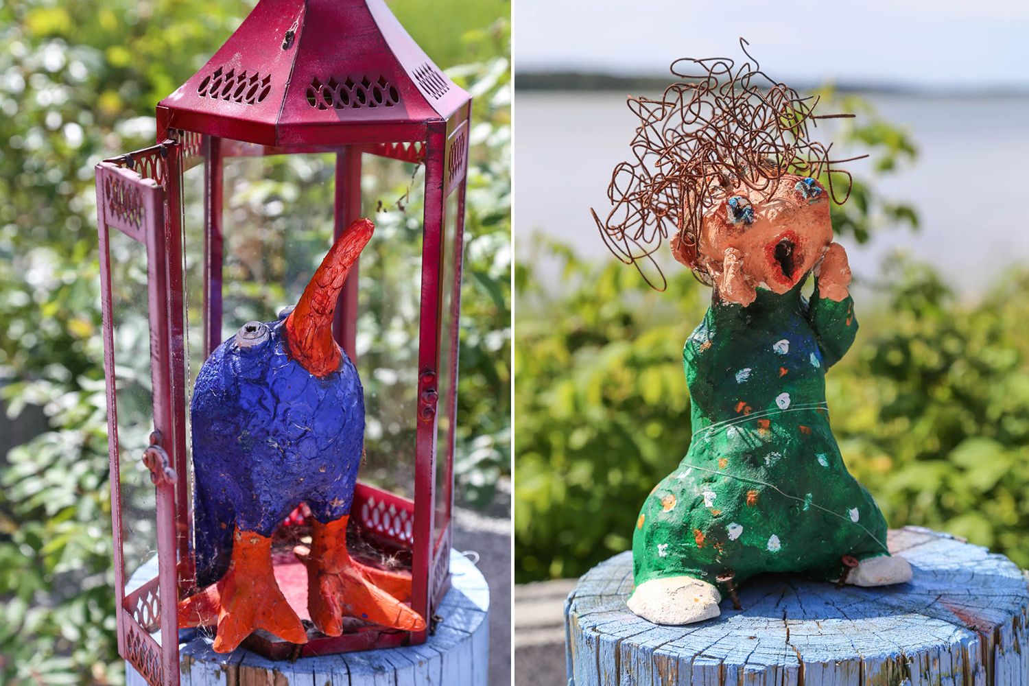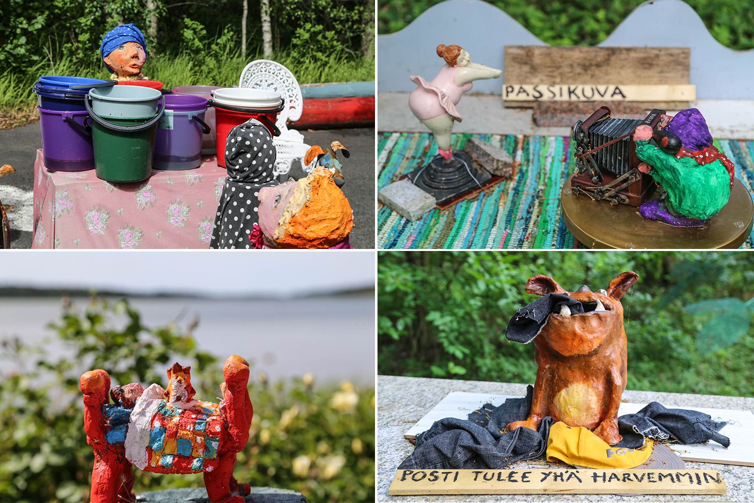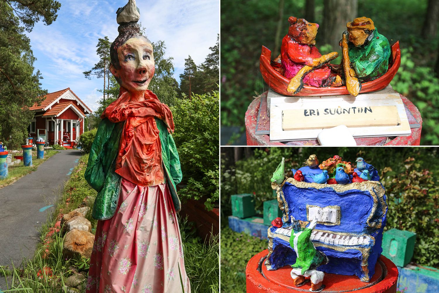 Hilpeät elämykset jatkuvat Pilvilinnan ulkopuolella. Meren reunustamassa puutarhassa kiertää taidepolku, jossa on yli kaksisataa Raijan tekemää veistosta. Jo niiden nimet kertovat, että täällä ei olla tosikkona liikenteessä. Jutun kuvat on muuten otettu taiteilijan erikoisluvalla: yleensä taidepolulla kuvaaminen on kielletty.