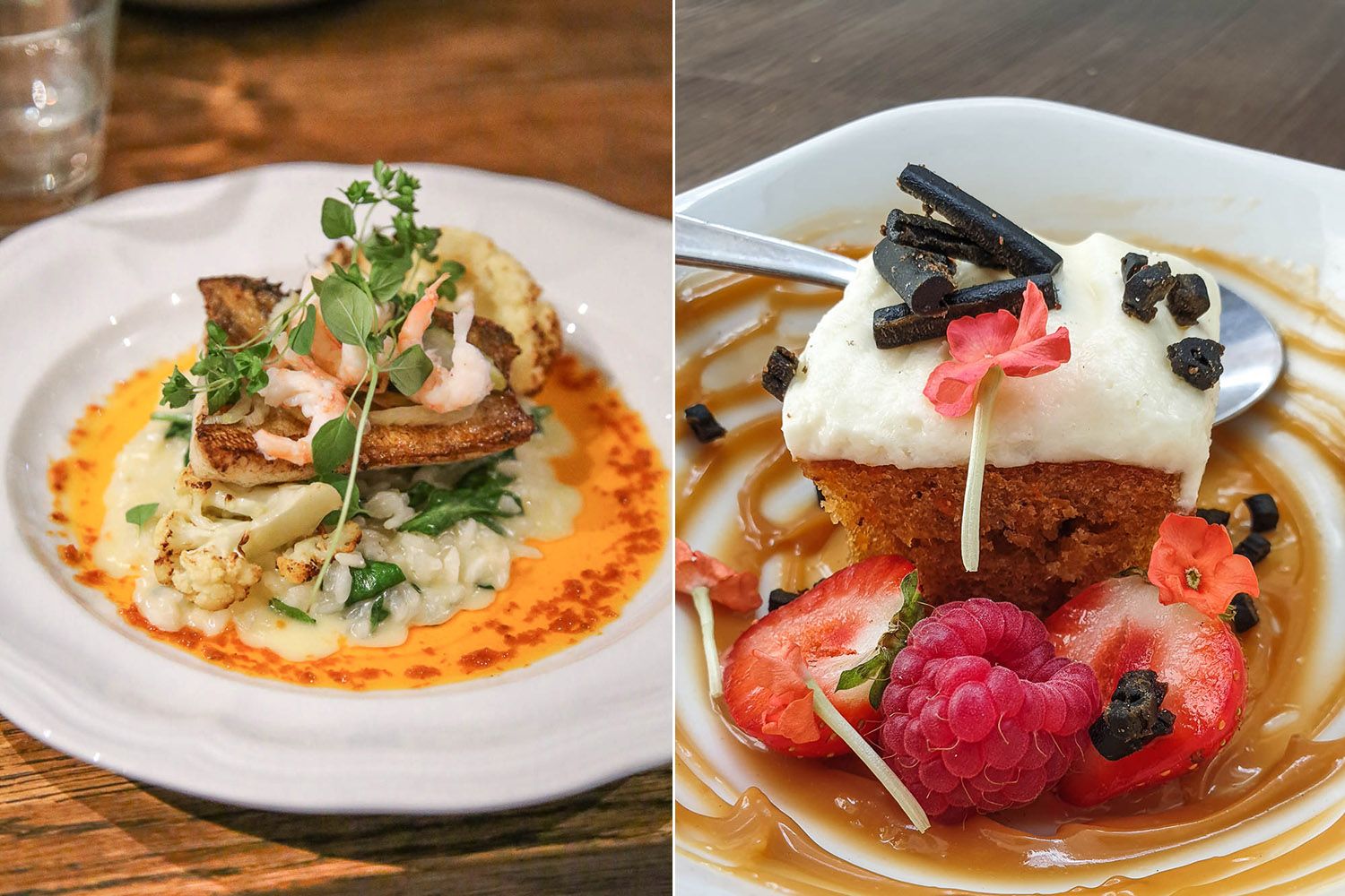 Illallisen söimme hotellin Trattoria Pielisessä. Ruuat olivat positiivinen yllätys (kokemuksesta sanon, ettei ole itsestäänselvyys, että tämä osuus hotelleissa toimii). Meillä on tapana Timpan kanssa usein jakaa ruokia, jotta päästään maistamaan mahdollisimman monet maut. Alkupaloiksi valitsimme listalta buffalamozzarellaa suolapähkinäpestolla ja peperoncinovoissa paistettuja jättikatkarapuja. Timppa tilasi pääruuaksi karitsan sisäfilettä, minä paistettua kuhaa, katkarapuja ja parmesaanirisottoa. Molemmat nappivalintoja. Tykkäsin varsinkin kala-annoksesta valtavasti. Jälkkäriksi valkkasimme suklaakakkua (kuvassa seuraavan päivän jälkkäri, tuorejuusto-porkkanakakku).