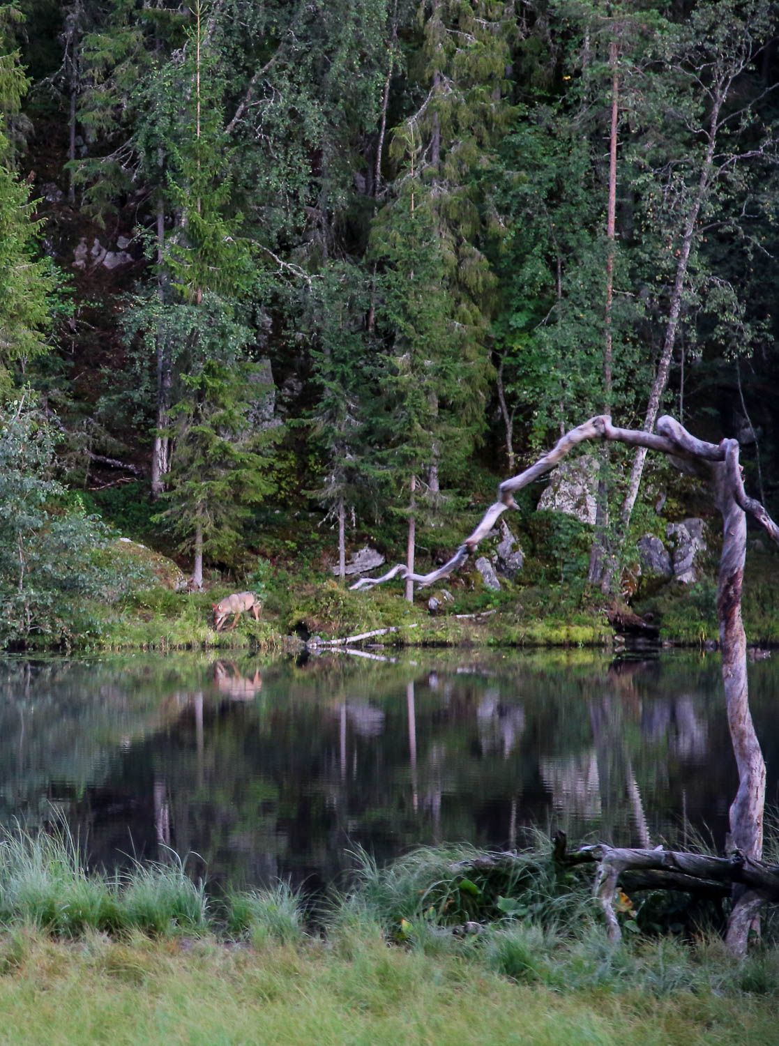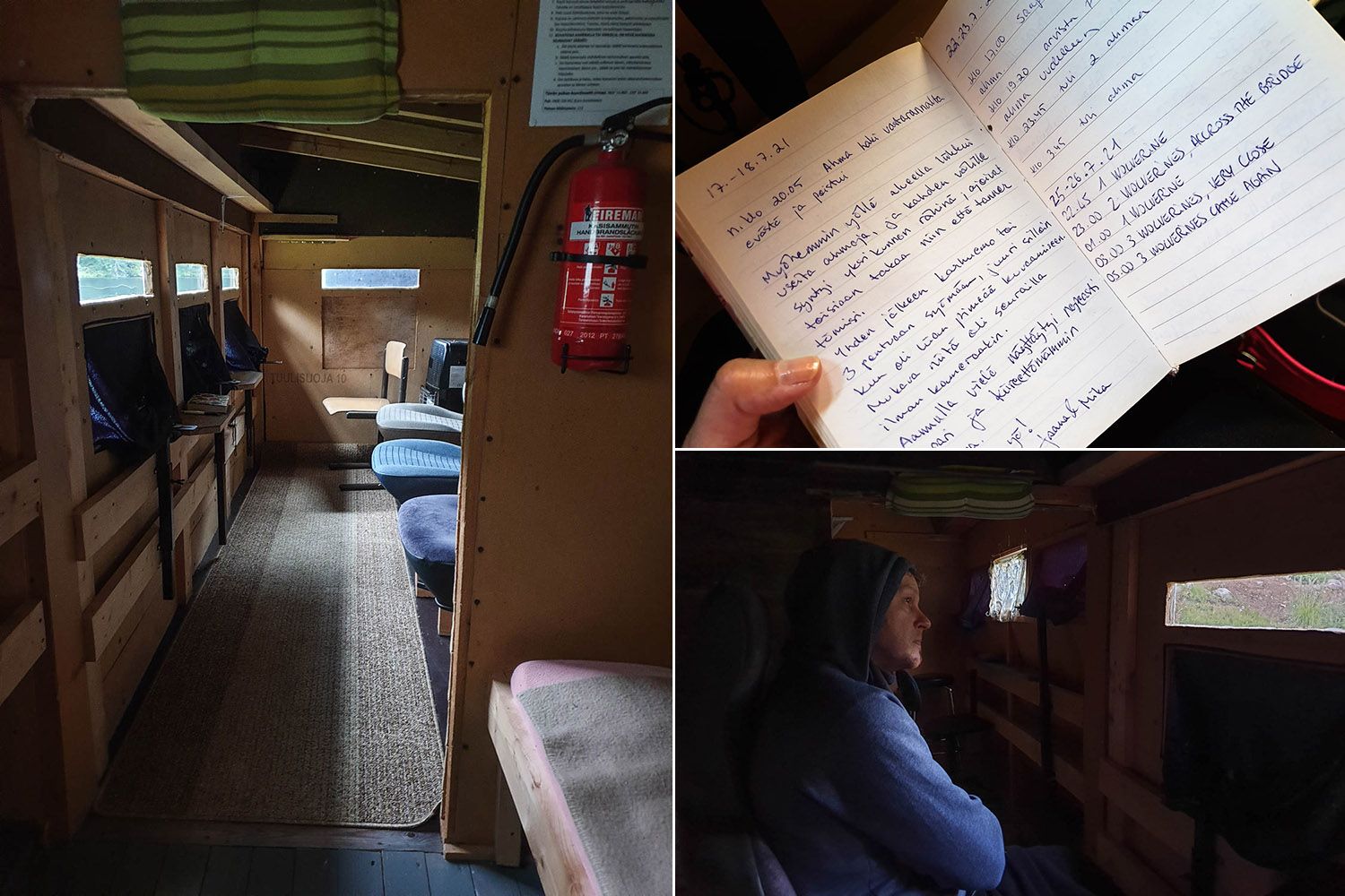 Hiljaa oleminen on muuten yllättävän vaikeaa. Tämän huomasin, kun yritin liikkua kojussa narisuttamatta lattioita tai tuoleja. Ja yritäpä ujuttaa käsi leipäpussiin niin, ettei se rapise! Mahdoton tehtävä. Timpan mielestä olinkin alkuillasta kuin levoton marakassi. Sitten väsymys alkoi tehdä tehtävänsä ja istuin pian aloillani raukeana sfinksinä. Kuusi tuntia tuijotimme pienestä tähystysikkunasta ulos ja yritimme haravoida katseella metsänlaitaa. Alkuillasta herkkupalojen kimppuun kävivät pikimustat korpit. Klo 21:09 metsästä pujahti vihdoin esiin susi, joka kuopi maata ja etsi kätköjä. Kaveri tähyili koppeihin päin ja hyöri ympäriinsä levottomana, mutta jatkoi salapoliisihommia parinkymmenen minuutin ajan. Merkinnät havainnoista teimme kojun päiväkirjaan, josta oli kiva lukea muidenkin vieraiden merkintöjä.