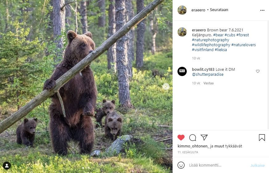 Erä-Eeron Instagram-tililtä pääsin tutkimaan kyläilijöitä tarkemmin. Tämä emo on kolmen pentunsa kanssa pyörinyt kuulemma säännöllisesti huudeilla. Ensi vuonna olisi mahtava tulla tänne alkukesästä, jolloin yöt ovat valoisia ja kuvaaminenkin onnistuisi varmaan paremmin.