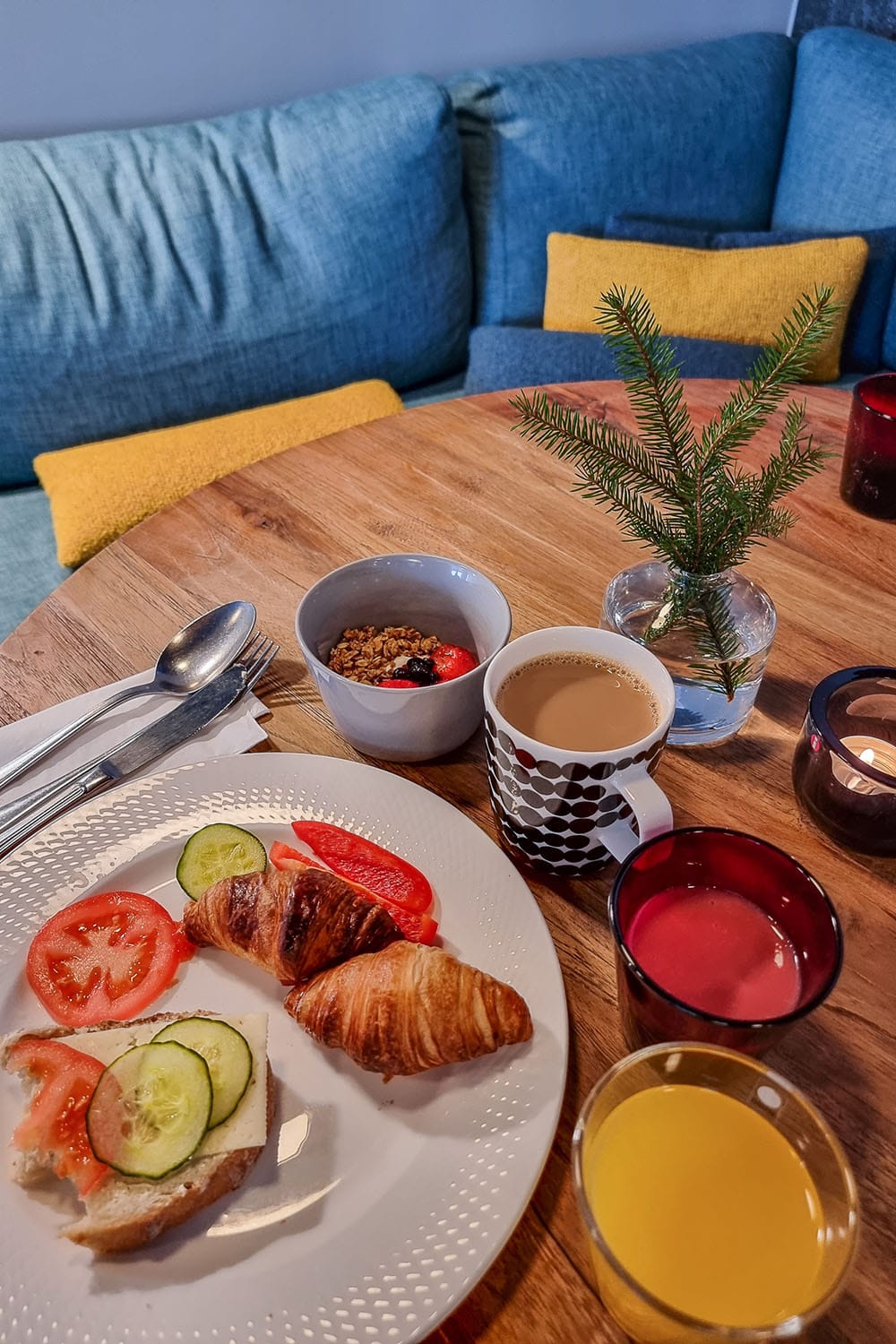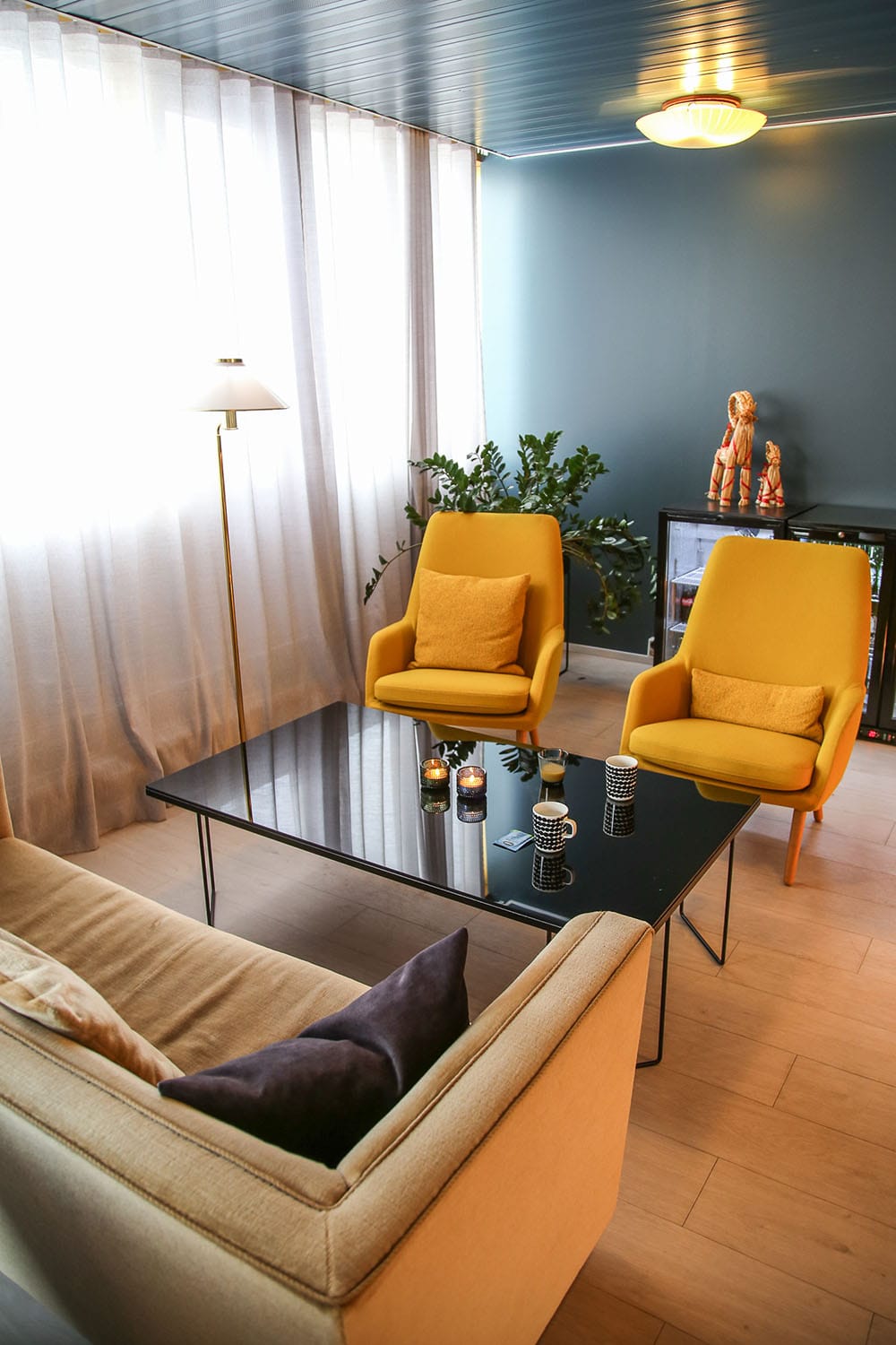 Piispankadulla, aivan vanhan Porvoon kupeessa sijaitseva Hotel Sparre oli uusi tuttavuus meille, vaikka hotelli on ollut samalla paikalla 1980-luvun lopusta saakka. Ulkoa päin 40 huoneen hotelli ei näytäkään kovin kummoiselta, mutta sisäpuolella on tehty muutama vuosi sitten varsin onnistunut remontti. Värimaailmasta löytyy petrolinsinistä, keltaista, konjakinruskeaa, harmaata ja hiekansävyä. Sisustuksessa on hyödynnetty osittain hotellin vanhoja kalusteita ja kierrätysmateriaaleja, mutta valaisimista voi bongata Louis Poulsenia ja astioista Marimekkoa ja Iittalaa. Hotellin yleisilme on pelkistetty mutta kodikas.