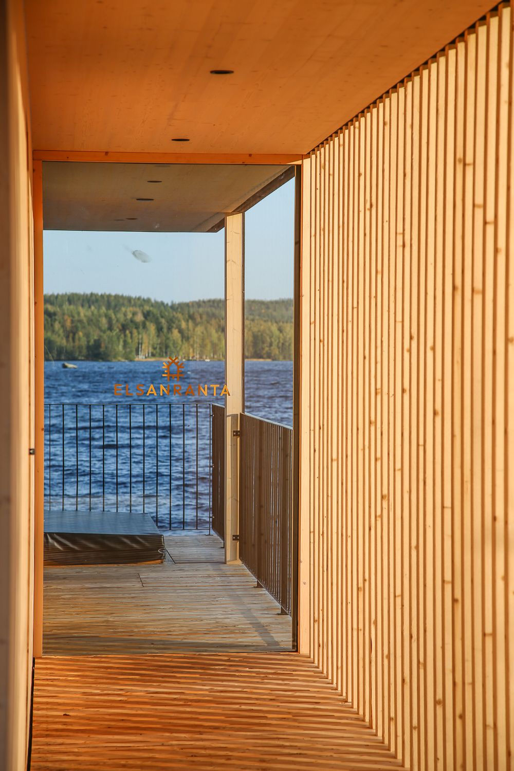 Elsanrannassa on viisi Sigge Arkkitehtien suunnittelemaa paritaloa eli yhteensä kymmenen kahden hengen huoneistoa. Päämateriaalina on puu ja se tuoksuukin vielä uutuuttaan koko niemellä. Rakennusten pelkistetty tyylikkyys miellytti ainakin meidän silmää ja pääsi oikeuksiinsa varsinkin ilta-auringossa. Ensin jännitti, onko paritaloissa yksityisyyttä, mutta villat on suunniteltu niin, että naapurin kanssa ei törmää välttämättä ollenkaan. Sisäänkäynnitkin ovat eri puolilla rakennusta.